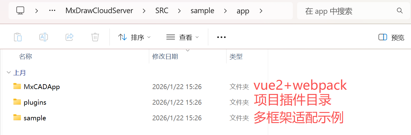 跳转至 SRC/sample/app/MxCADApp 目录,供开发者参考完整的 Vue + TypeScript 集成项目源码。
