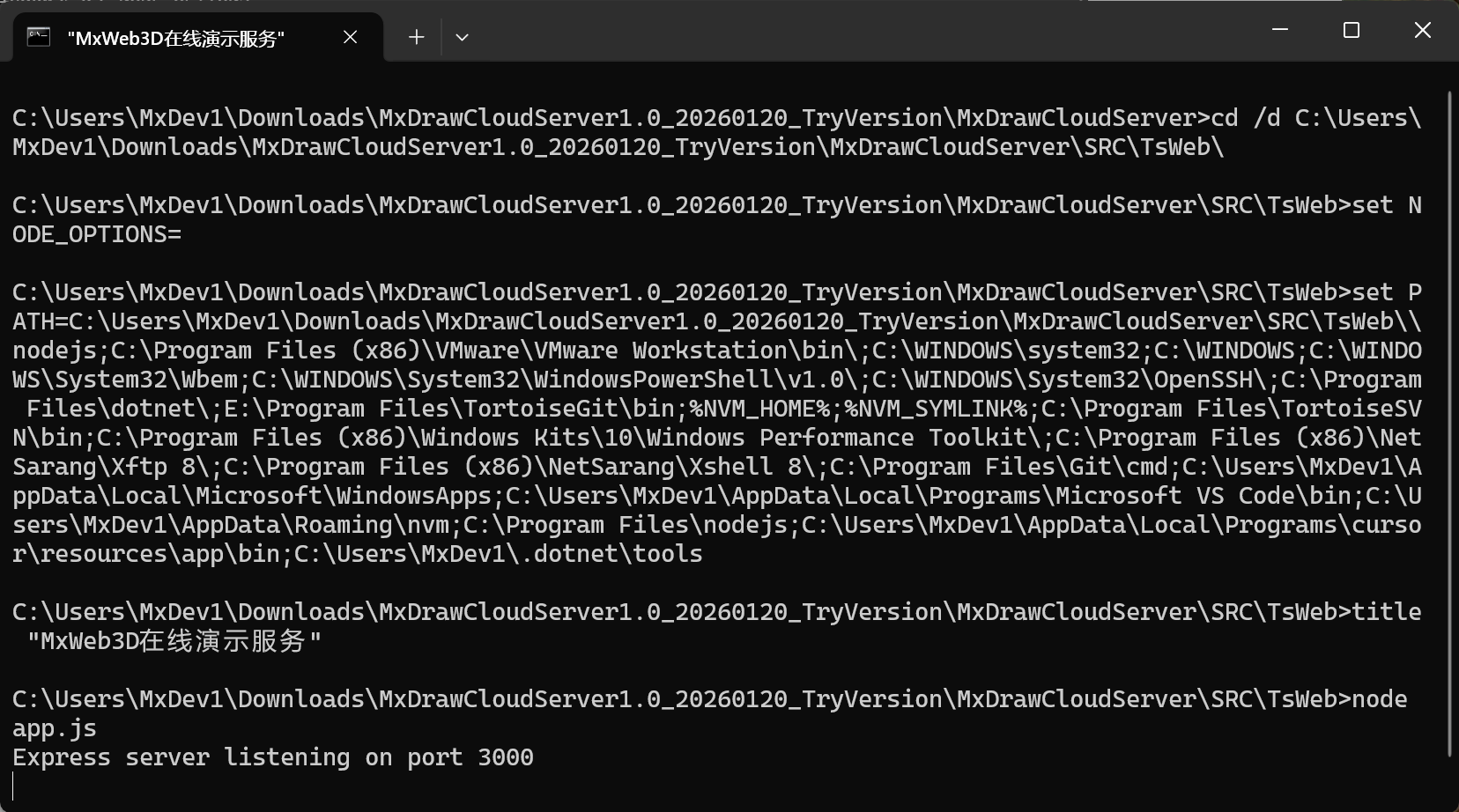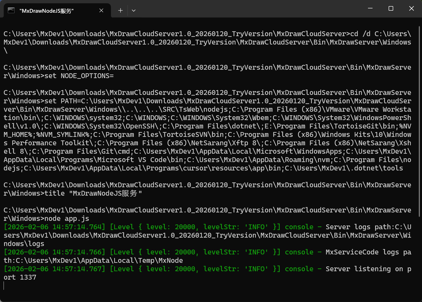 该服务由 Bin/MxDrawServer/Windows/app.js 脚本启动,是 MxDraw 的“大脑”。它负责处理所有与图纸相关的底层操作,例如打开 DWG 文件、解析图形数据、保存编辑结果等。虽然你看不到它的界面,但所有 CAD 功能都依赖它来完成。