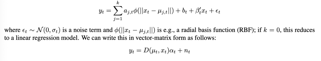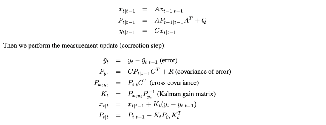 其中 f 和 g 是任意可微函数。基本思想是使用二阶泰勒展开将 f 和 g 在先前的状态估计上进行线性化,然后应用标准的卡尔曼滤波器方程。(方程中的噪声方差(Q 和 R)不变,即,由于线性化而产生的额外误差没有被建模。)因此,我们用非平稳线性动态系统来近似平稳非线性动态系统。也就是说,在时间 t,我们通过以下方式近似模型: