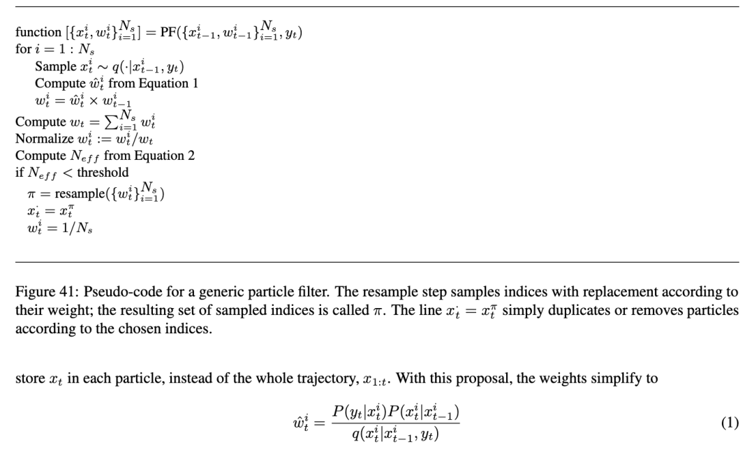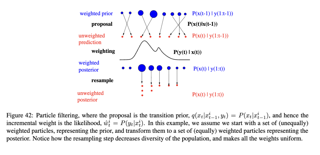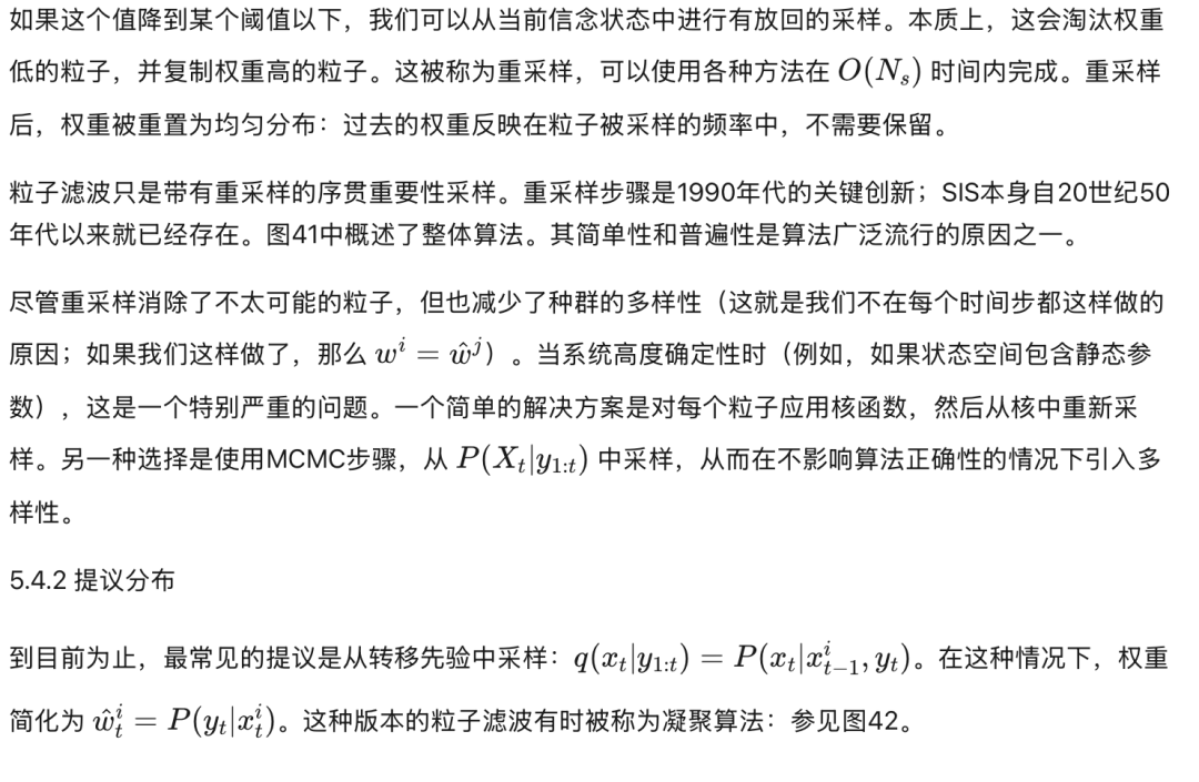 到目前为止描述的算法被称为序贯重要性采样(SIS)。SIS的一个众所周知的问题是,随着时间的推移,一个归一化的重要性权重趋向于1,而其他权重趋向于零(即使我们使用最优的提议分布:参见第5.4.2节)。因此,大量样本实际上被浪费了,因为它们的权重可以忽略不计。这被称为粒子“贫化”。