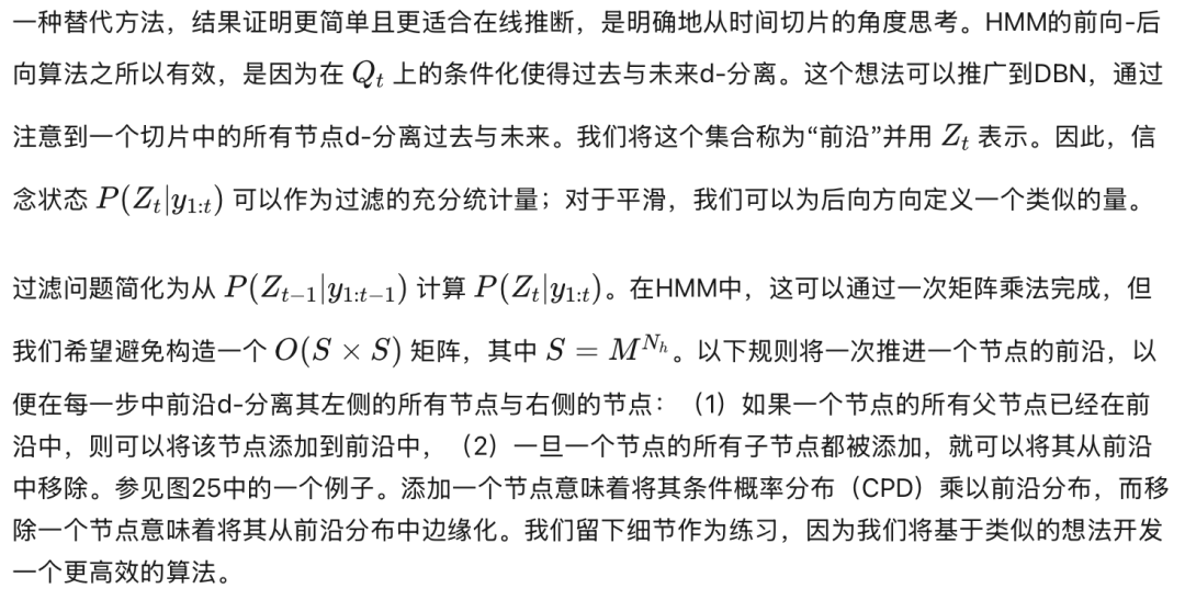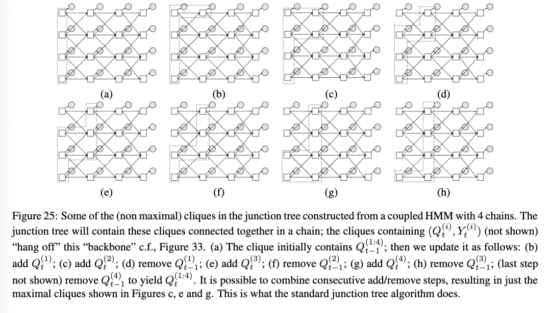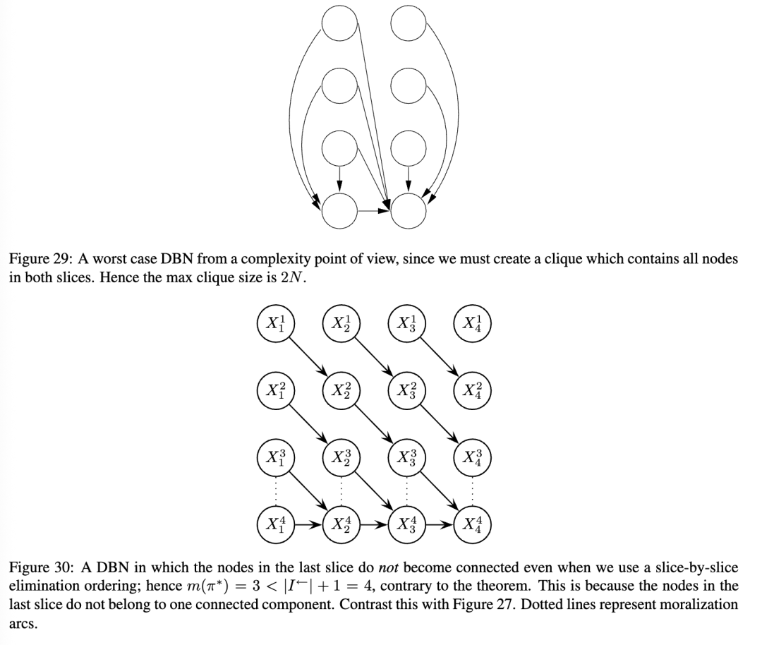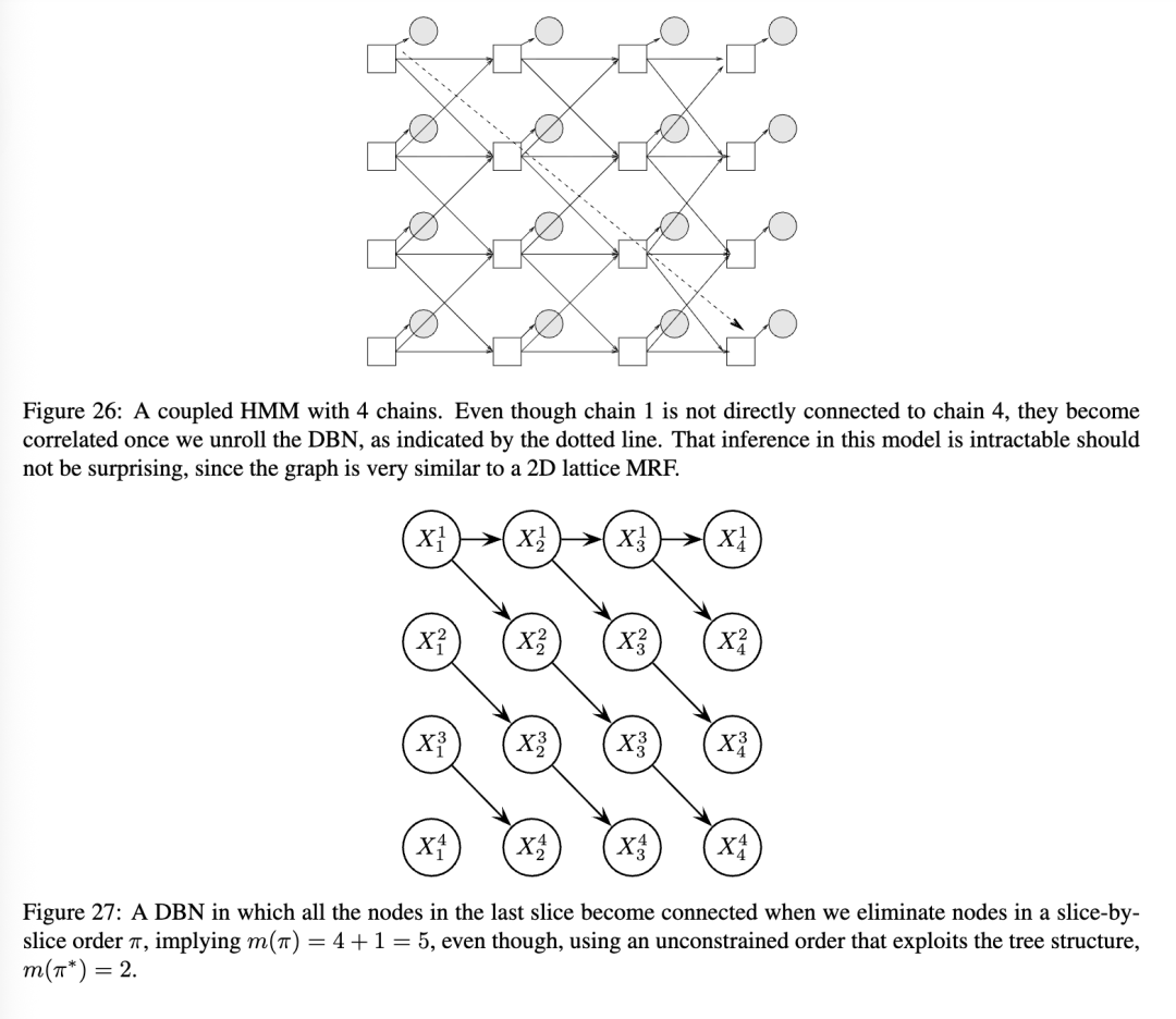 不幸的是,当我们从展开的DBN创建一个连接树时,团(cliques)往往非常大,这常常使得精确推断变得难以处理。特别是,对于每个时间切片(可能除了序列的开始和结束附近),通常会有一个团包含该切片中所有具有跨切片连接的节点。(我们将在下面更详细地说明)。参见图25中的一个例子。图26说明了这一点的直观原因:即使切片内的节点没有直接相关,它们最终也会因为共享过去的共同祖先而变得相关。