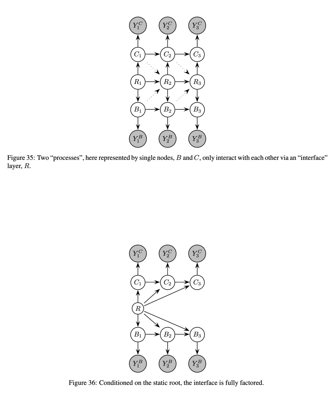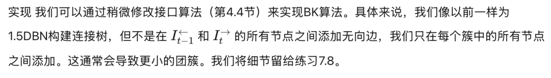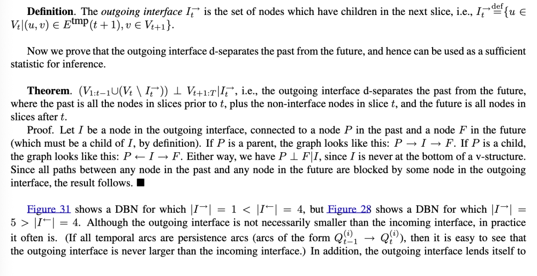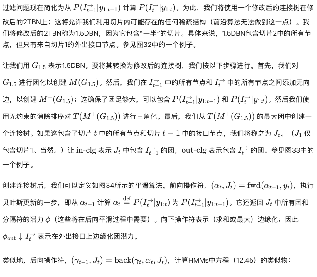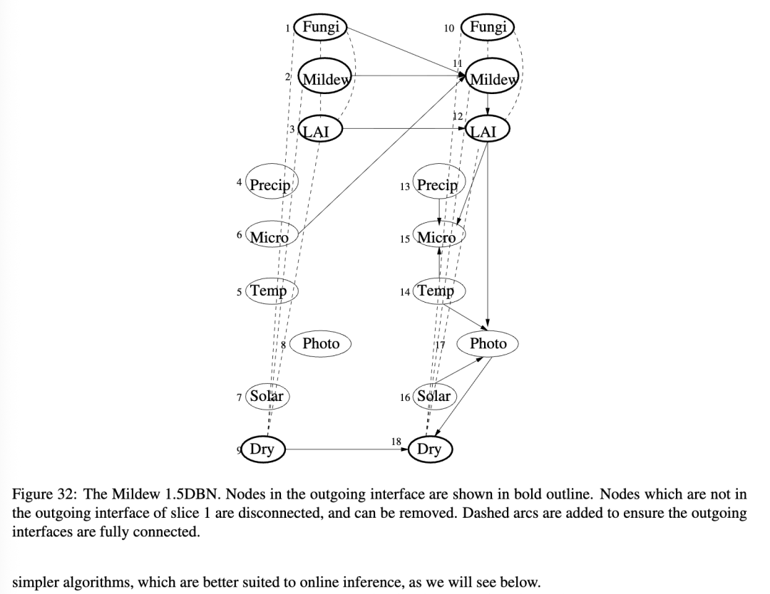 不幸的是,当我们从展开的DBN创建一个连接树时,团(cliques)往往非常大,这常常使得精确推断变得难以处理。特别是,对于每个时间切片(可能除了序列的开始和结束附近),通常会有一个团包含该切片中所有具有跨切片连接的节点。(我们将在下面更详细地说明)。参见图25中的一个例子。图26说明了这一点的直观原因:即使切片内的节点没有直接相关,它们最终也会因为共享过去的共同祖先而变得相关。