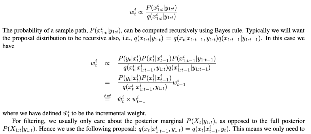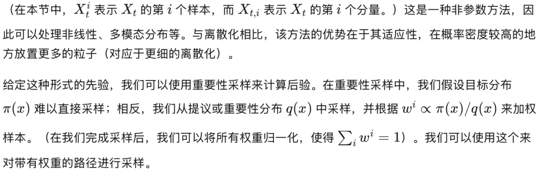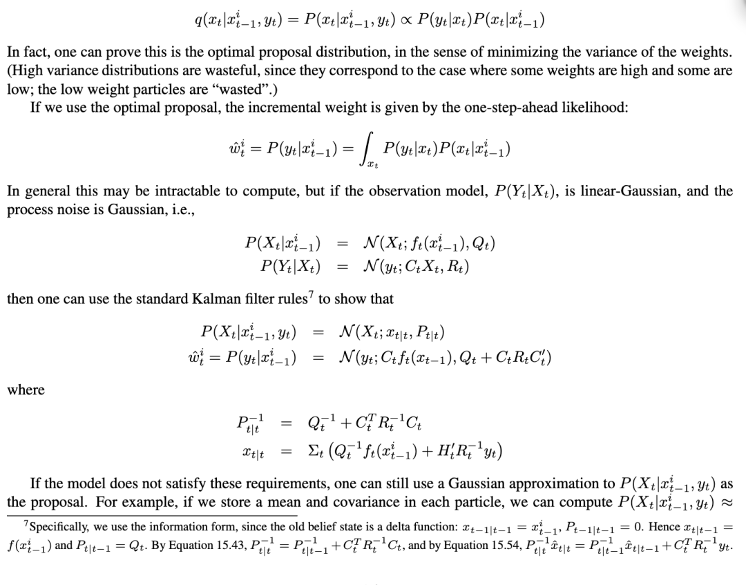 对于预测未来,从转移先验中采样是足够的,因为没有未来的证据。但对于监控/过滤来说,这并不高效,因为这相当于“猜直到猜对”。例如,如果转换具有高度随机性,从先验中采样将导致粒子在整个状态空间中被提出;如果观测具有高度信息性,大多数粒子将被“淘汰”(即,被赋予低权重)。在这种情况下,首先查看证据