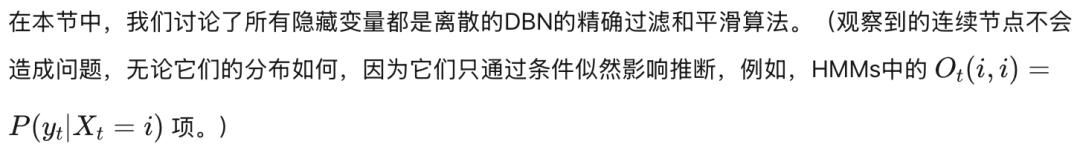 我们将专注于在线过滤和离线平滑;其他问题可以通过类似的方法解决。区分所有隐藏节点都是离散的模型和一些(或全部)隐藏节点是连续的模型会很有帮助,因为它们需要不同的解决技术(正如我们在HMM中的推断与SSM中的推断需要不同的技术一样)。