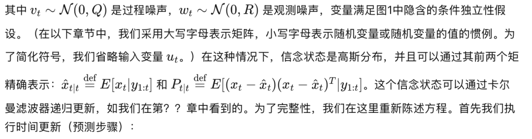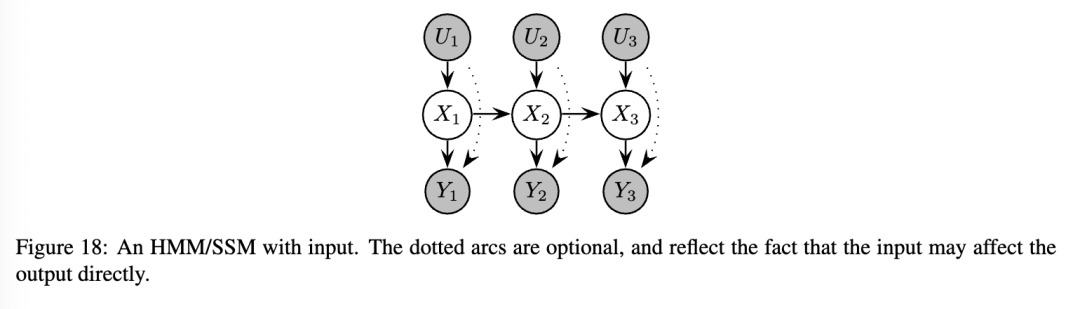 状态空间模型(SSM)的图结构看起来与隐马尔可夫模型(HMM)的图结构相同,因为它做出了相同的条件独立性假设。通常还会包括一个输入节点,如图18所示。在状态空间模型中,所有节点都是连续的,所有的条件概率分布(CPDs)都是线性高斯的,即,