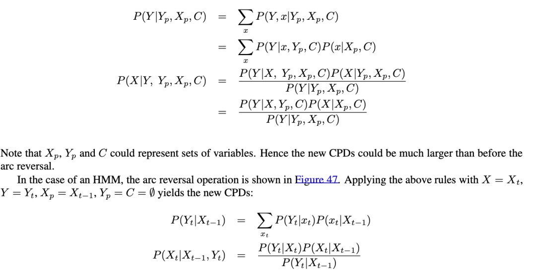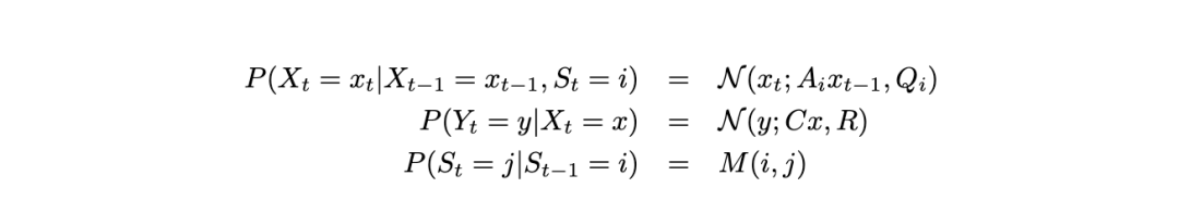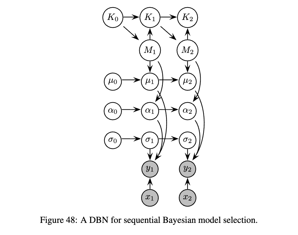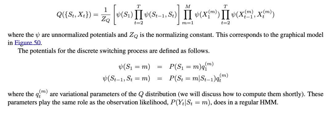 在图22中,我们展示了一个切换状态空间模型(也称为切换线性动态系统(LDS)、跳跃马尔可夫模型、跳跃线性系统、条件动态线性模型(DLM)等)。基本思想是模型可以在不同类型的动态“模式”或“状态”之间切换。(由此产生的分段线性是近似非线性动态的一种方式。)这些模式本身的动态由一个离散状态马尔可夫链控制。因此,条件概率分布(CPDs)如下: