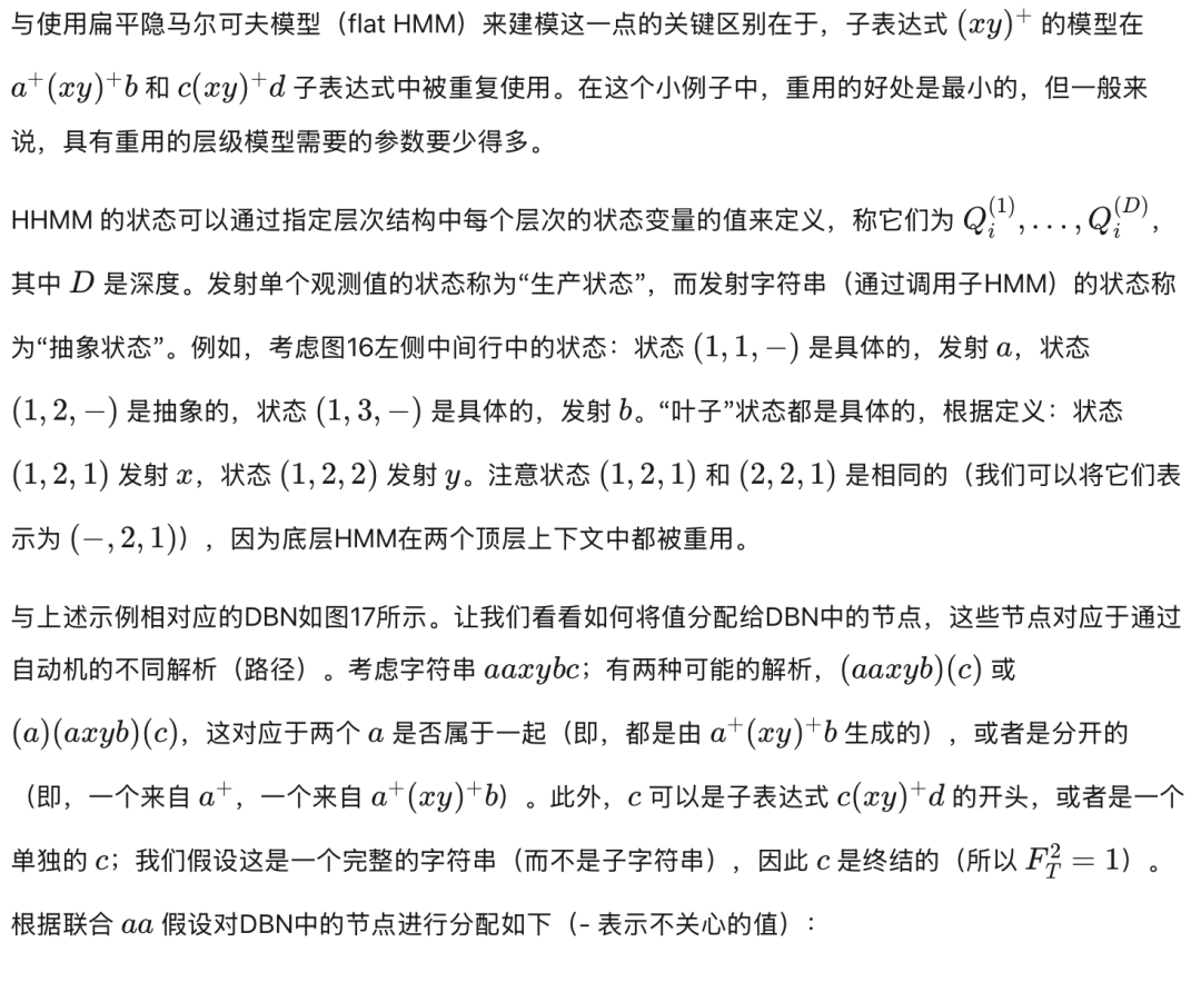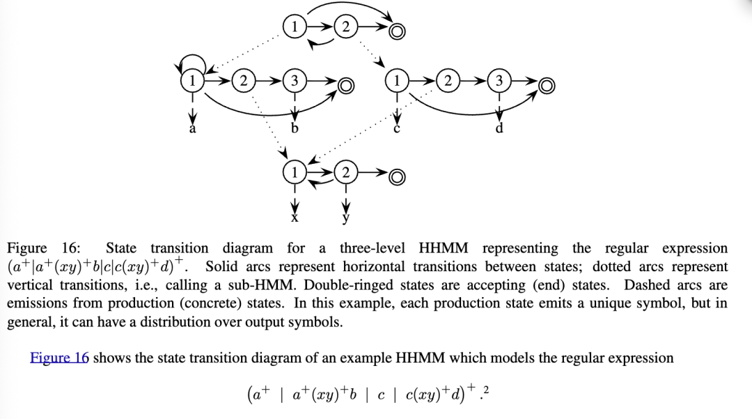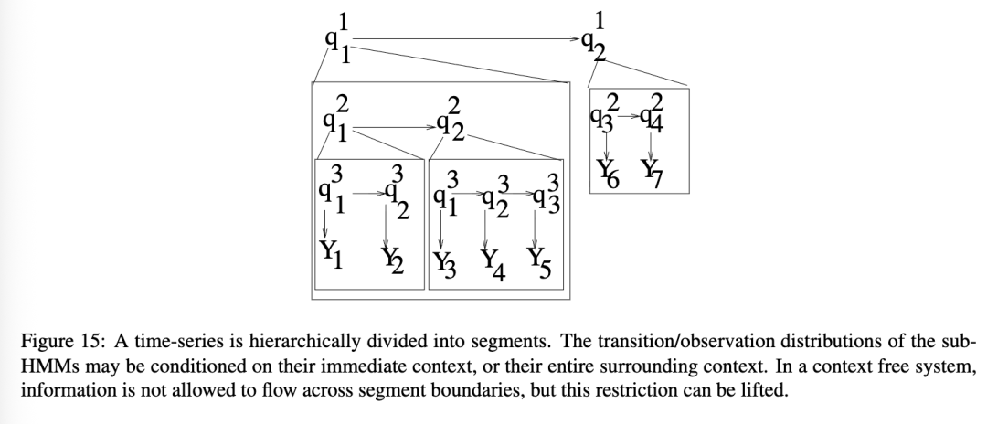 层级隐马尔可夫模型(HHMM)是段隐马尔可夫模型(segment HMM)的推广。它允许段隐马尔可夫模型以层级方式由段子隐马尔可夫模型组成。图15展示了基本概念的示意图。此外,不是用随机变量指定每个段的长度,而是通过子隐马尔可夫模型进入其结束状态所需的时间隐式定义长度。(到结束状态的转换可能由某些环境条件触发。)进入结束状态会终止该段,并将控制权返回给调用状态,然后调用状态可以自由变化。