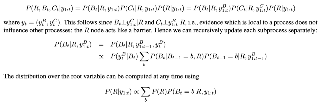由于该模型同时具有离散和连续的隐藏变量,因此有时被称为混合动态贝叶斯网络(DBN)。在这种模型中进行精确推断是非常困难的,正如我们在第5.2.4节中讨论的那样。与自回归隐马尔可夫模型(HMM)(第2.2节)形成对比,后者所有隐藏变量都是离散的,使得精确推断变得容易。