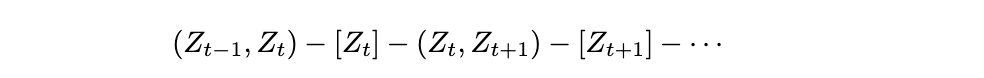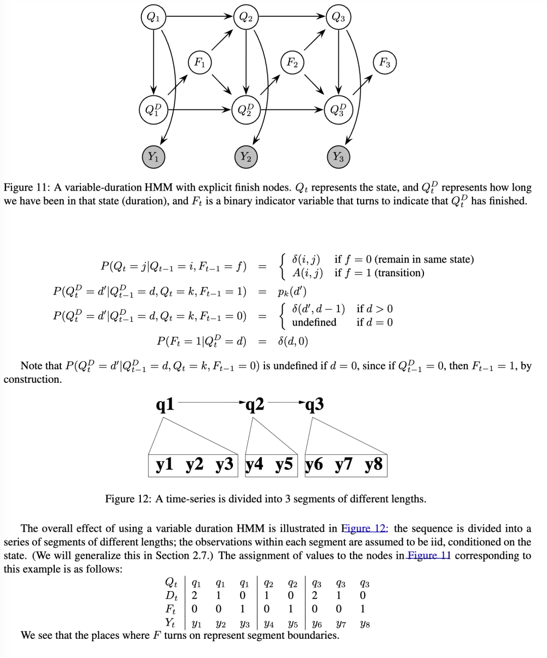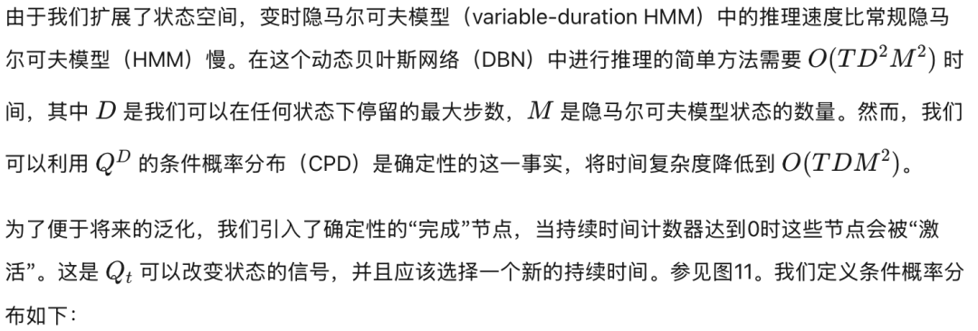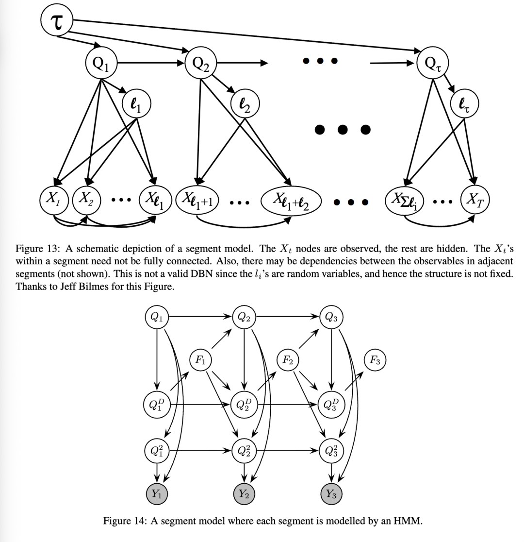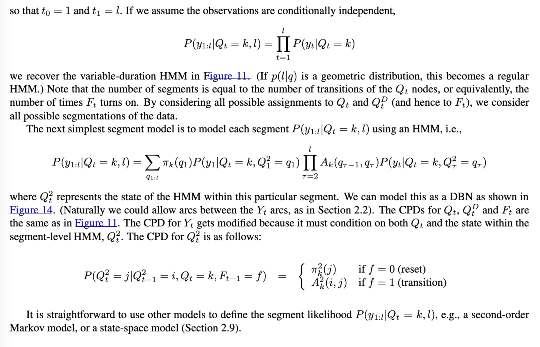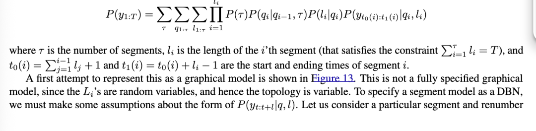 段模型的基本思想是每个隐马尔可夫模型(HMM)状态可以生成一系列观测值,如图12所示,而不仅仅是单个观测值。与变时隐马尔可夫模型(variable-duration HMM)的区别在于,我们不假设每个段内的观测值是条件独立的;相反,我们可以使用任意模型来表示它们的联合分布。似然性由以下公式给出: