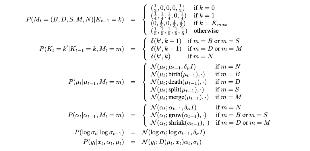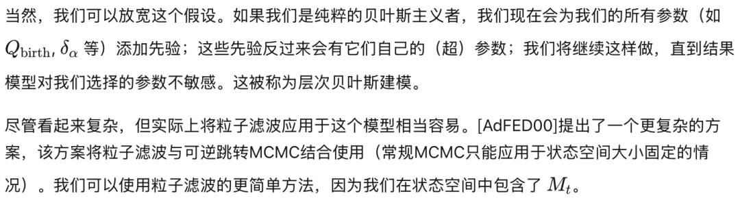 在某些应用中,状态空间的大小事先不是固定的。例如,当我们跟踪多个对象时,每个测量可能由它们中的任何一个引起,背景,或者可能是进入“场景”的新对象。这个问题出现在视觉跟踪、雷达跟踪导弹以及移动机器人中,特别是在SLAM(同时定位与地图构建)问题中。