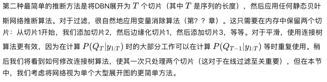 无约束排序的另一个问题是以下内容。我们不希望每次改变序列长度时都不得不计算一个新的消除排序,因为这太慢了。相反,我们希望对一个固定大小的DBN进行三角化,识别结果连接树中的团,然后通过复制重复结构来重用它们,适用于所有序列长度。为了确保连接树中出现这样的重复结构,我们必须使用时间上受限的消除排序。即便如此,涉及动态改变连接树结构的簿记工作也变得相当棘手。