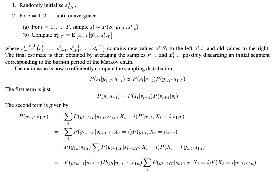 一个可能使用此方法的示例是在切换SSM中。(在这种情况下,使用吉布斯采样而不是EP或变分方法的优势是,算法最终可能会收敛到正确答案。)基本算法如下: