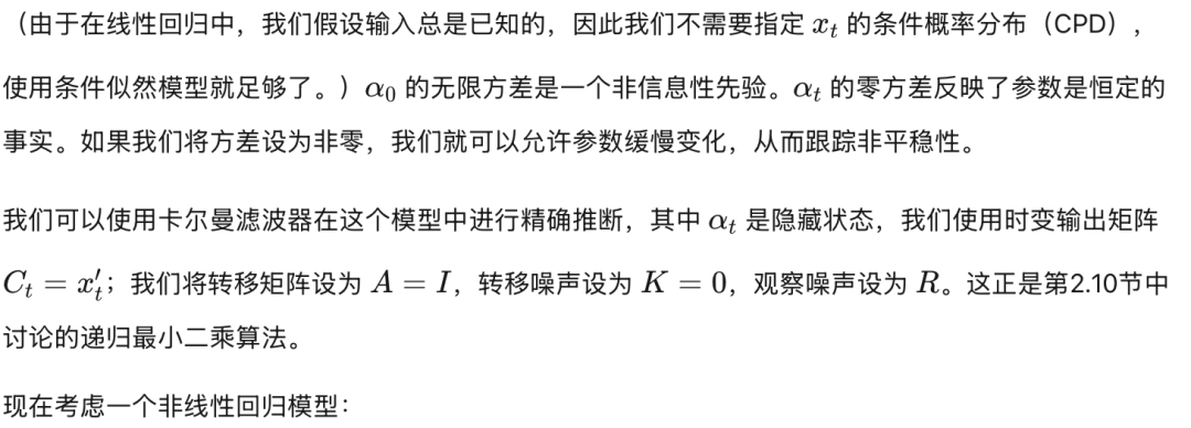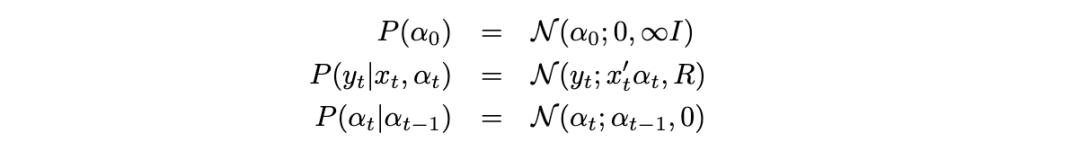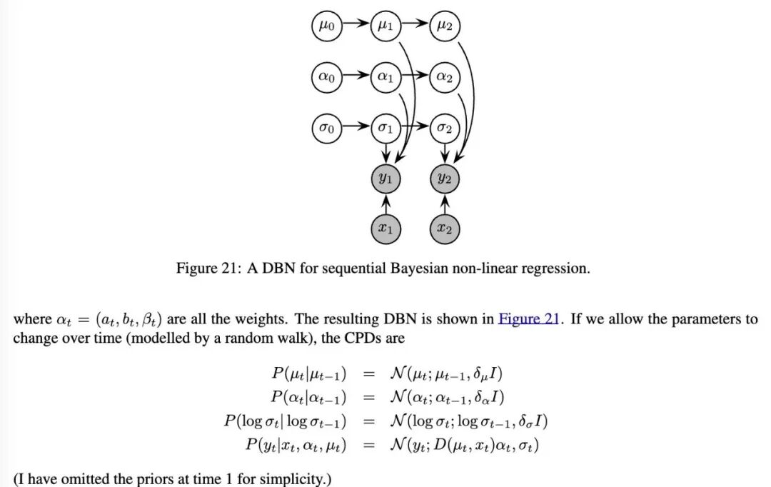 例如,假设我们想要递归地(即顺序地)估计线性回归模型中的系数 α,其中我们假设噪声水平 R 是已知的。这可以如图20所示进行建模。条件概率分布(CPDs)如下: