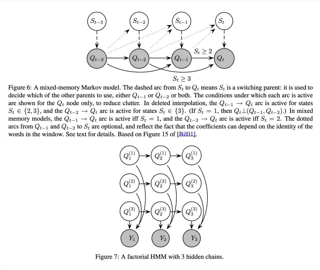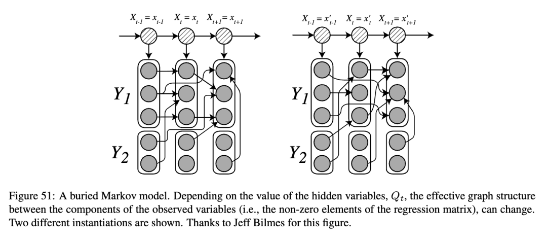 “埋藏式”马尔可夫模型通过允许可观测节点之间存在非线性依赖关系,推广了自回归HMMs(第2.2节)。此外,依赖关系的性质会根据Qt的取值而改变:参见图51中的示例。此类模型被称为动态贝叶斯“多网络”,因为它是不同网络的混合体。讨论为在这些模型中进行推断,前向-后向算法需要做出哪些(如有)修改。