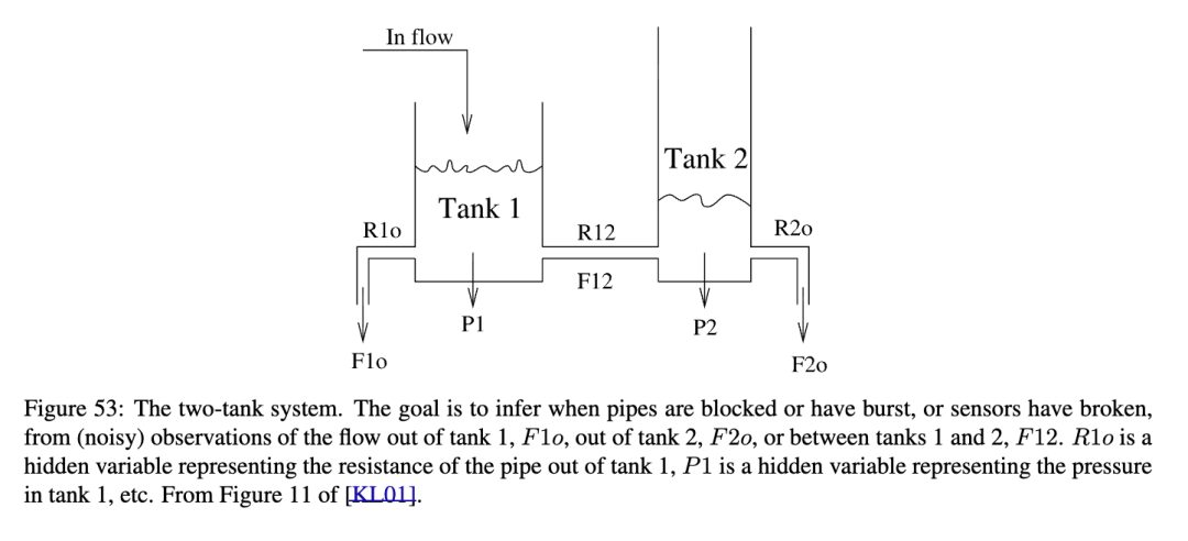 切换状态空间模型(SSMs)的一个重要应用是用于故障诊断。例如,考虑图53中的“双水箱”系统,这是故障诊断领域的一个基准问题(尽管通常人们会考虑n个水箱,其中n远大于2)。这是一个非线性系统,因为流量 = 压力 / 阻力(或流量 = 压力 × 电导率)。更成问题的是,阻力值可能会缓慢漂移,或因管道破裂而发生不连续变化。此外,传感器也可能间歇性失效并给出错误结果。请说明如何将此模型表示为动态贝叶斯网络(DBN)。