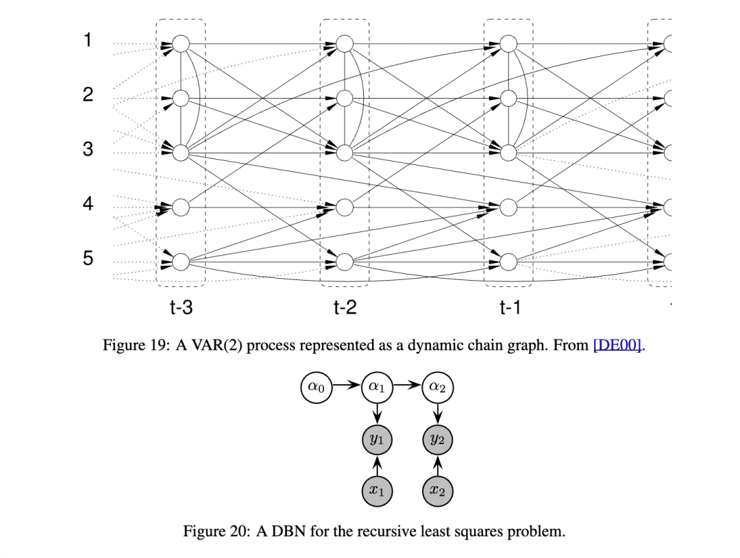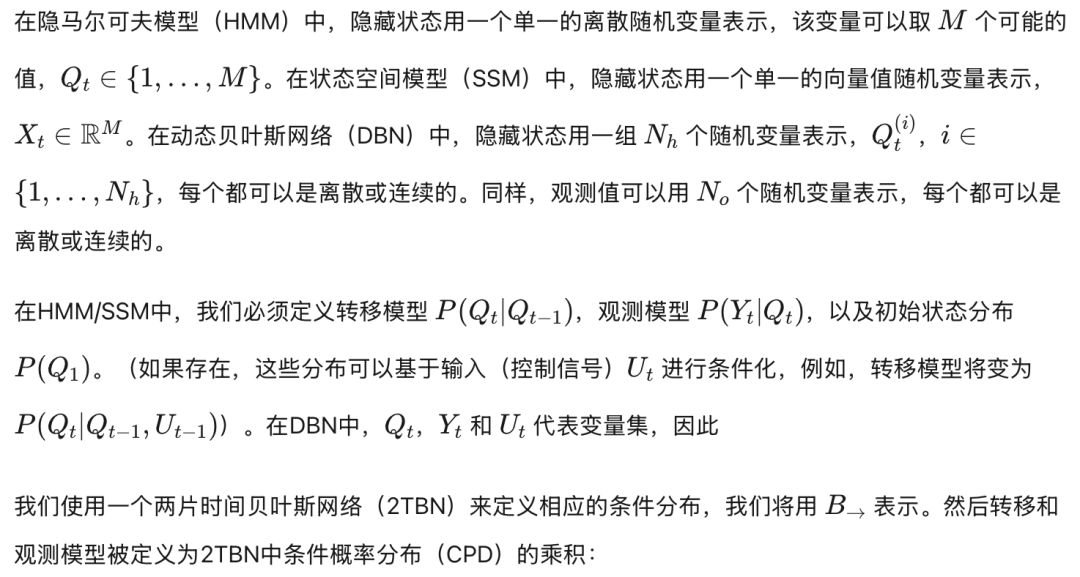 对于时序数据建模,采用有向图模型(directed graphical models)是自然的选择,因其能体现时间单向流动的特性。“时间片内”(within a time-slice)的弧可为有向或无向,用以刻画变量间的“瞬时”相关性;若所有弧——包括片内与片间——均为有向,则该模型称为动态贝叶斯网络(Dynamic Bayesian Network, DBN)。此处“动态”意指我们所建模的是一个动态系统,并非指图结构随时间变化。DBN因其易于解释与学习而广受欢迎:由于图结构是有向的,每个节点的条件概率分布(CPD)可被独立估计。本章将聚焦于DBN。