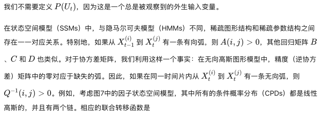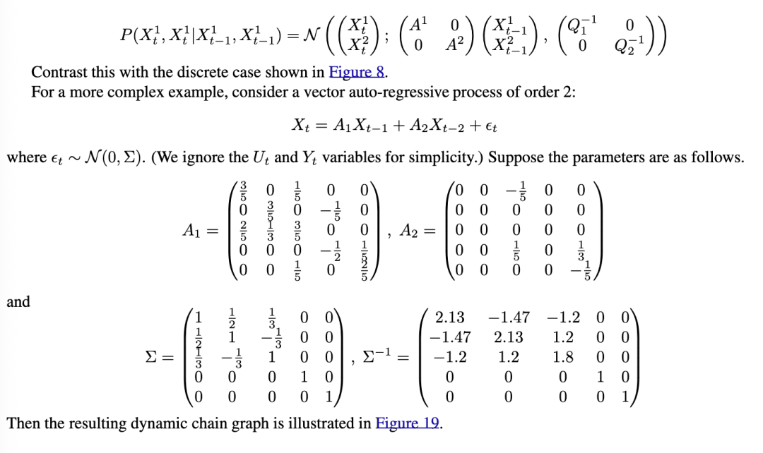 因此,自由参数,即方程右侧的成对转移矩阵,以一种难以拆解的方式组合在一起:见图8。相比之下,如果所有的条件概率分布(CPD)都是线性高斯的,那么得到的联合分布是一个多元高斯分布,稀疏的图形结构对应于传统意义上具有许多零的稀疏矩阵:见第2.9节。