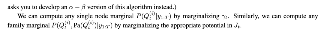 本练习开发了一种前向-后向算法的版本,该算法在 O(S log T) 的工作空间内计算 P(Xₜ | y₁:ₜ),而非 O(ST) 的空间(忽略表示算法输入和输出所需的空间)。这对于从长序列中学习模型很有用,因为充分统计量 Σₜ P(Xₜ | y₁:ₜ) 可以存储在常数空间内。