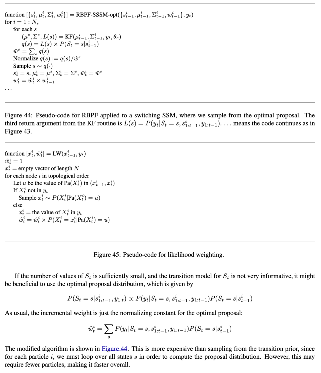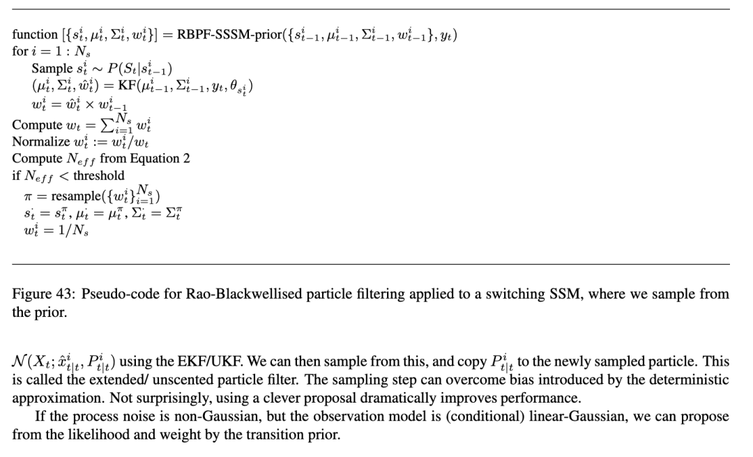 修改后的算法如图444所示。这比从转移先验中采样更昂贵,因为对于每个粒子 i,我们必须遍历所有状态 s 以计算提议分布。然而,这可能需要更少的粒子,从而总体上更快。