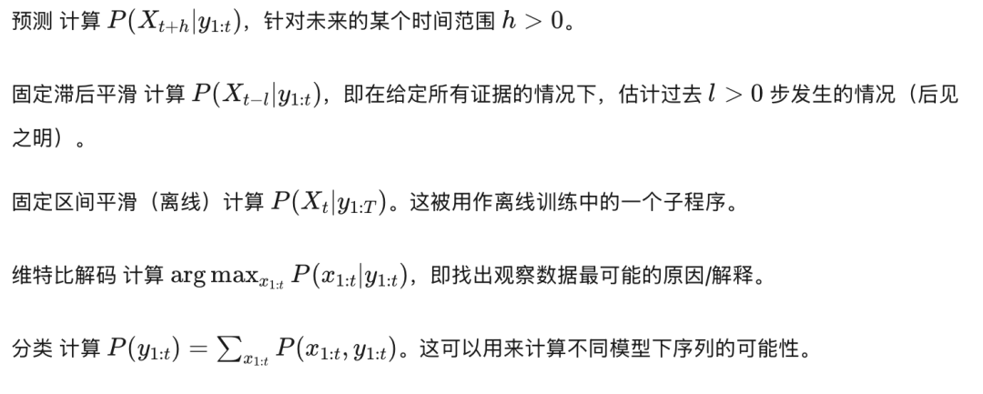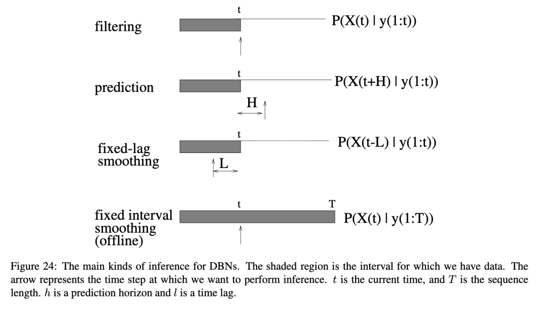 在观察了大量不同的动态贝叶斯网络(DBNs)之后,我们现在讨论如何在这些模型中执行推断。我们可能感兴趣的推断问题有多种(参见图24以获取摘要):