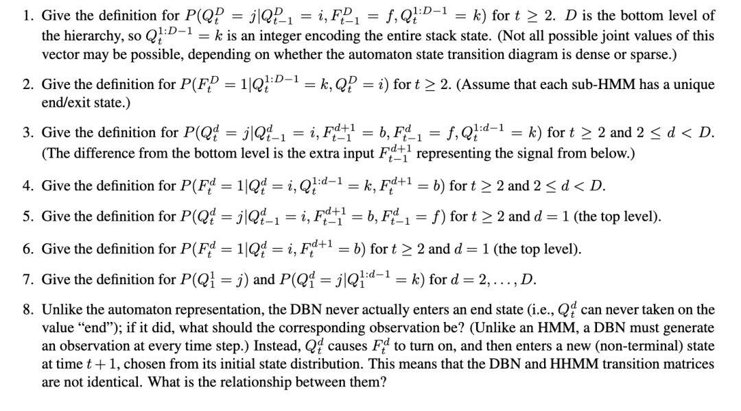 本练习要求你为HHMM的DBN表示定义CPDs。我们分别考虑层次结构的底层、中层和顶层(因为它们具有不同的局部拓扑结构),以及第一个、中间和最后一个时间切片。