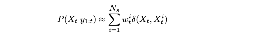 粒子滤波的基本思想是通过一组加权粒子或样本来近似信念状态: