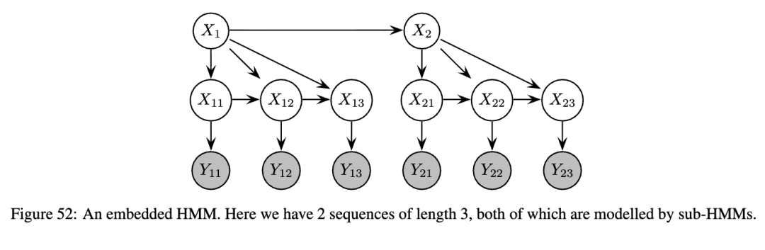 考虑为扫描文本等二维数据定义似然函数。自然地,可以使用一个HMM对图像的每一行建模,并使用另一个HMM对行与行之间的连接进行建模。这被称为伪二维或嵌入式HMM。基本思想如图52所示,其中我们有2行,每行长度为3。