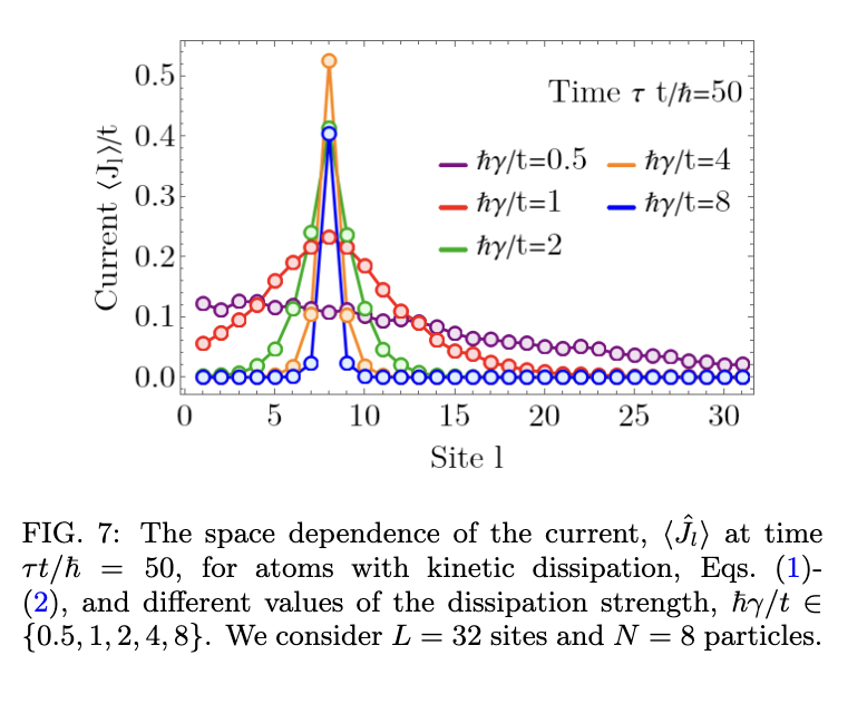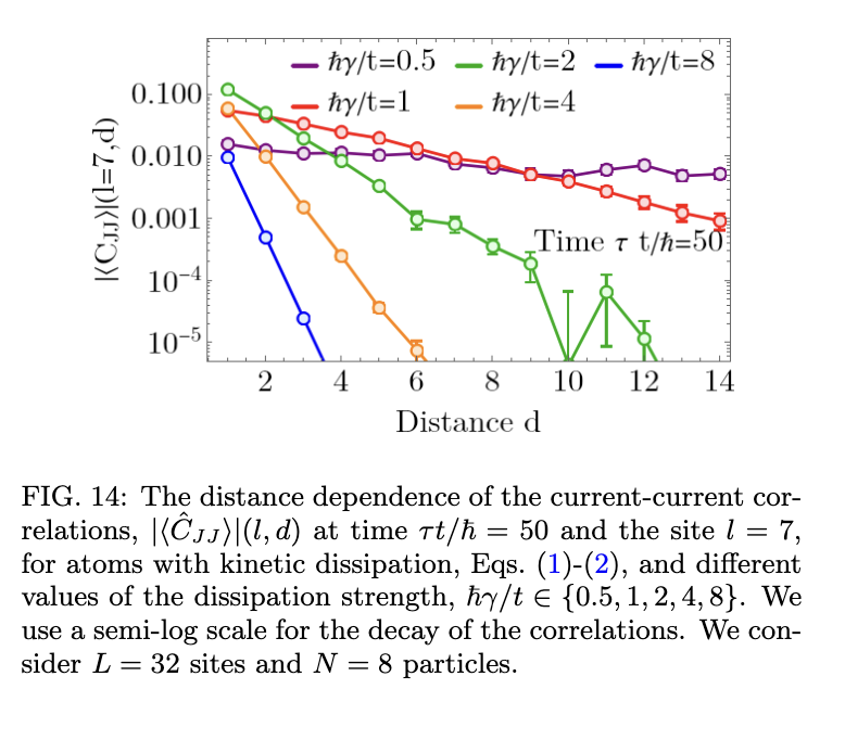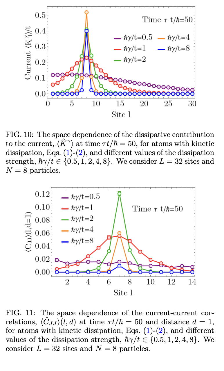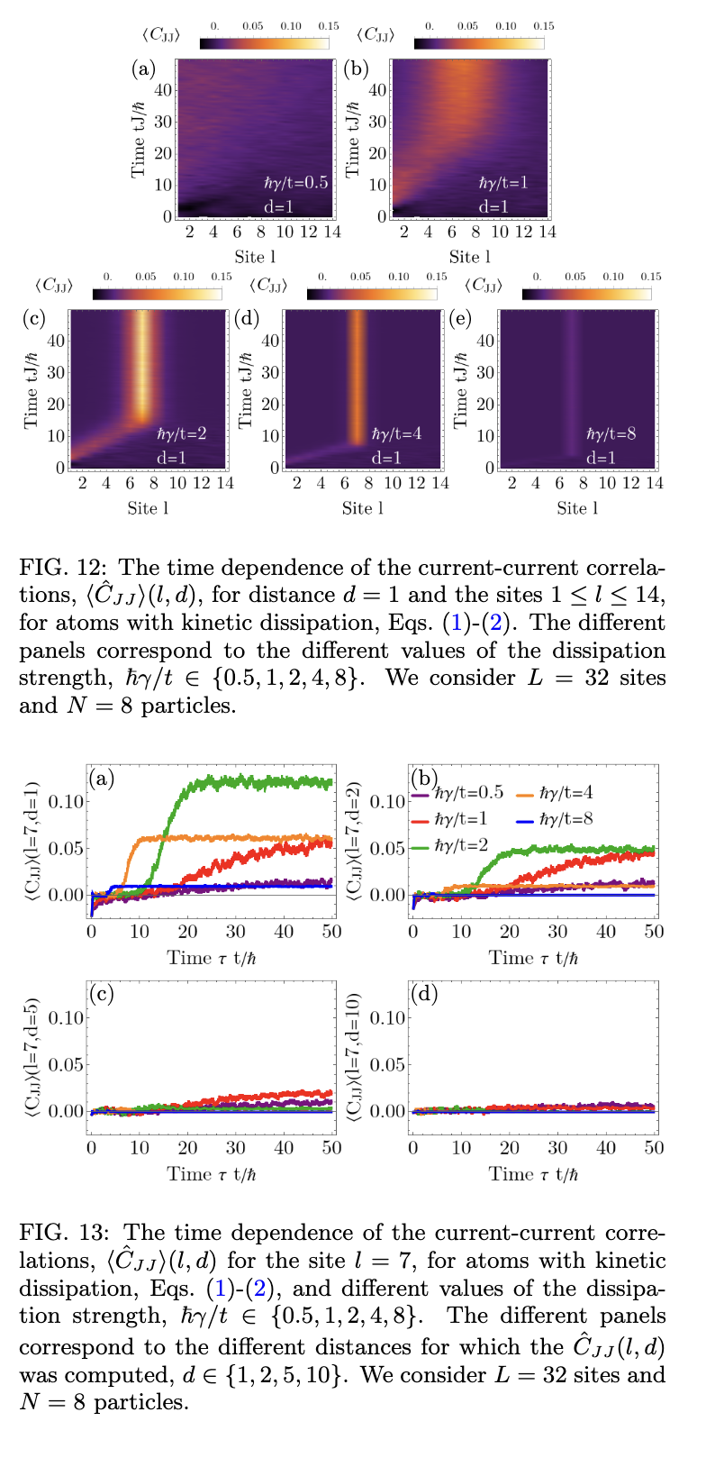我们采用矩阵乘积态方法,对两个模型中的量子关联进行了数值精确的耗散动力学计算。我们聚焦于如下问题:如何在诱导原子定向运动(表现为电流算符具有有限值)的同时,维持其量子相干性(由电流-电流关联所刻画)。对于经历动能耗散的原子系统(公式(1)-(2)),在强耗散条件下,原子会聚集在链的一端,在填充格点与空格点之间形成一个相当尖锐的界面。我们仅在此界面附近获得有限的电流值,且哈密顿量动能项与耗散过程对电流的贡献相互抵消。这可在半经典图像中理解为:哈密顿量的隧穿作用使原子远离界面,而动能耗散又将其拉回。电流-电流关联的有限值同样局限于界面附近的狭窄区域,并随格点间距迅速衰减。