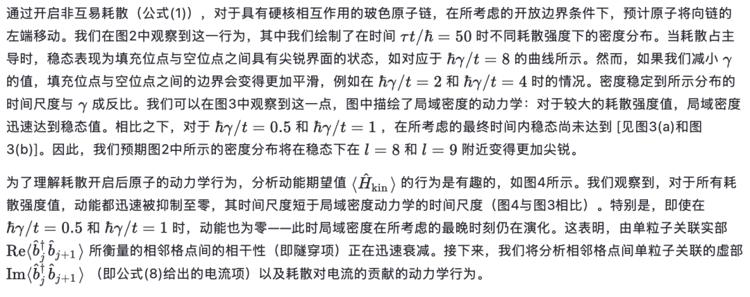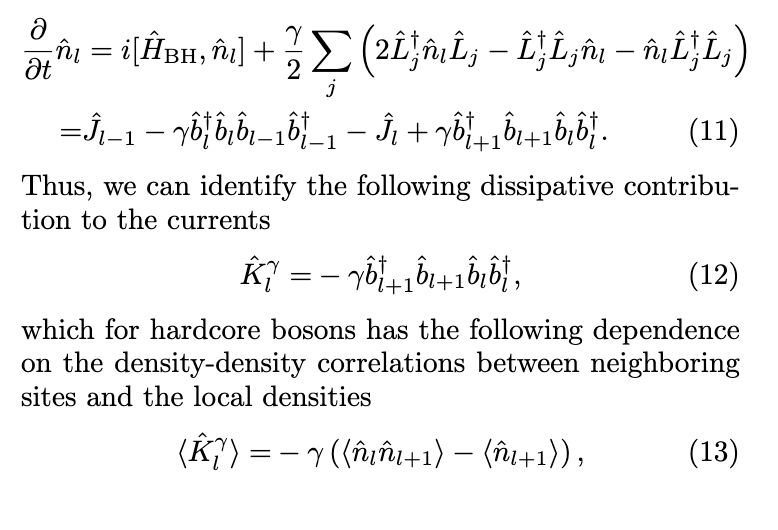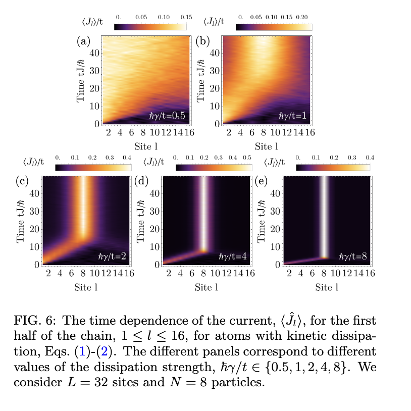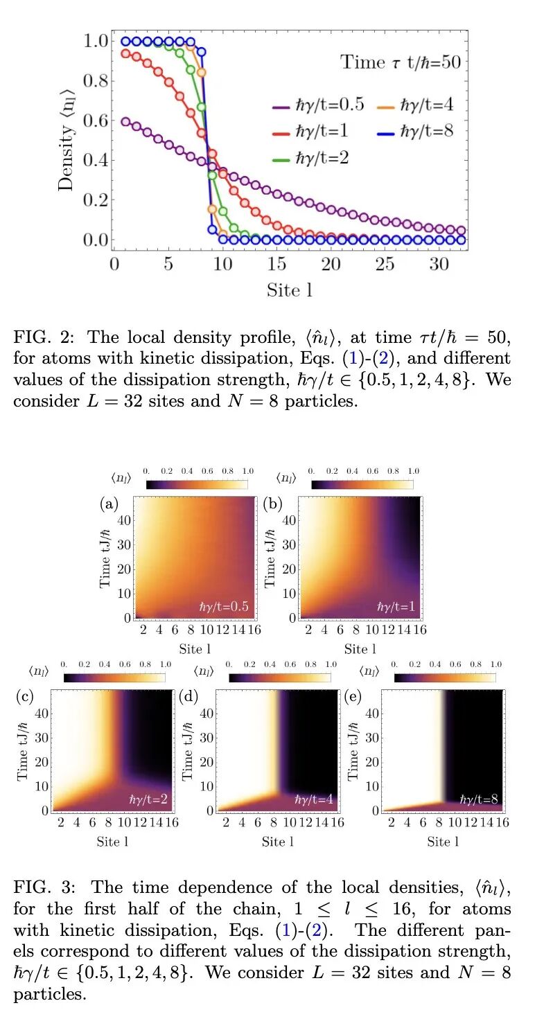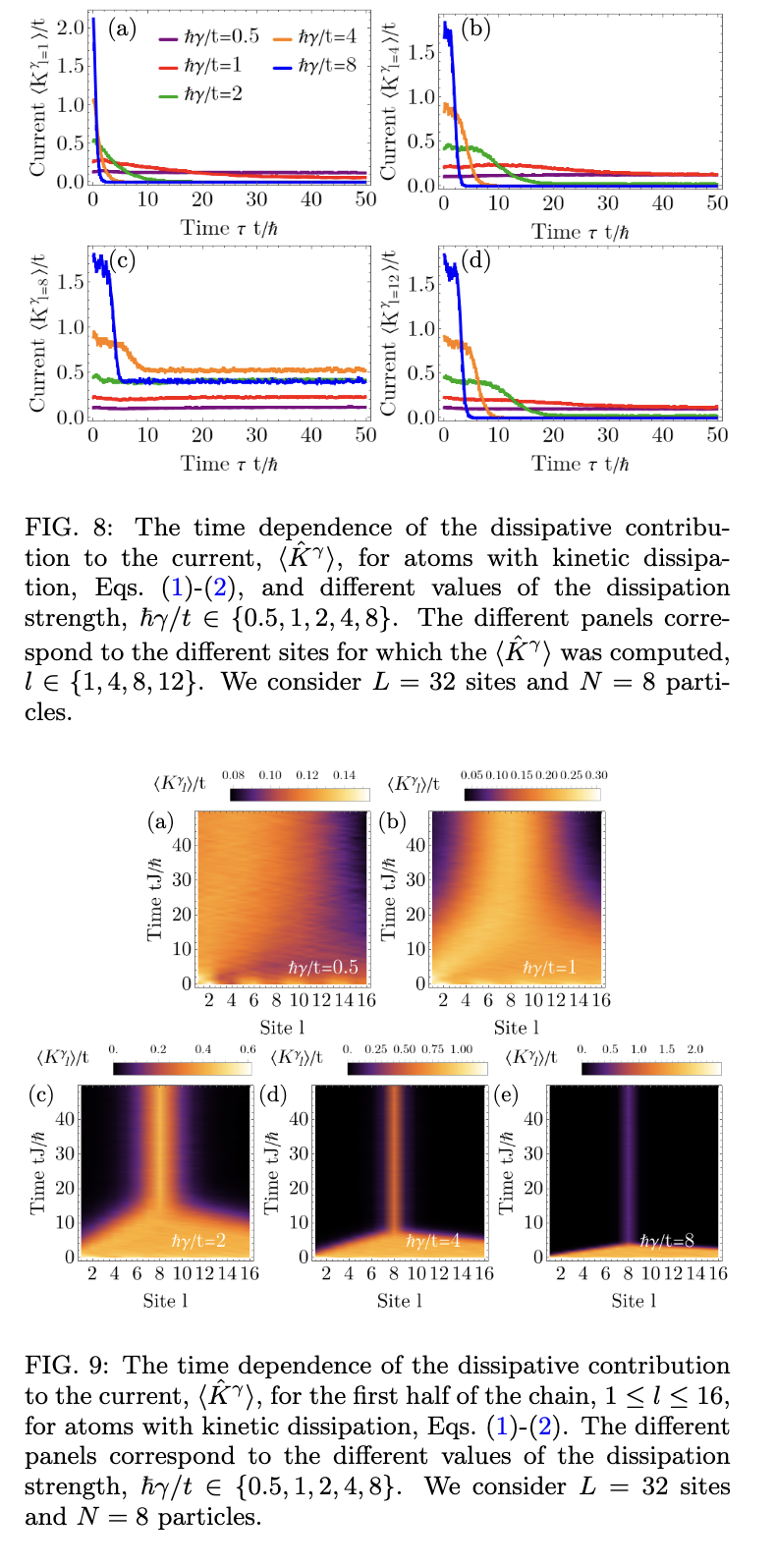 我们采用矩阵乘积态方法,对两个模型中的量子关联进行了数值精确的耗散动力学计算。我们聚焦于如下问题:如何在诱导原子定向运动(表现为电流算符具有有限值)的同时,维持其量子相干性(由电流-电流关联所刻画)。对于经历动能耗散的原子系统(公式(1)-(2)),在强耗散条件下,原子会聚集在链的一端,在填充格点与空格点之间形成一个相当尖锐的界面。我们仅在此界面附近获得有限的电流值,且哈密顿量动能项与耗散过程对电流的贡献相互抵消。这可在半经典图像中理解为:哈密顿量的隧穿作用使原子远离界面,而动能耗散又将其拉回。电流-电流关联的有限值同样局限于界面附近的狭窄区域,并随格点间距迅速衰减。