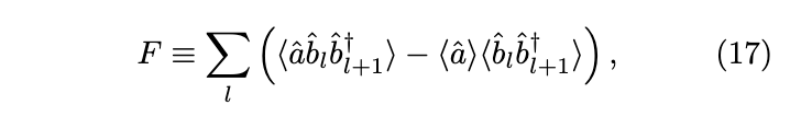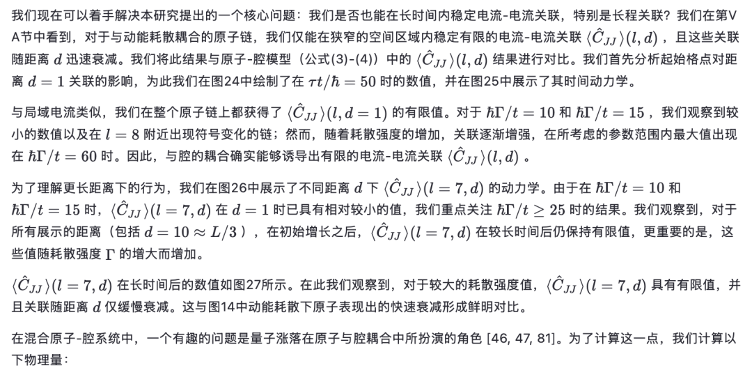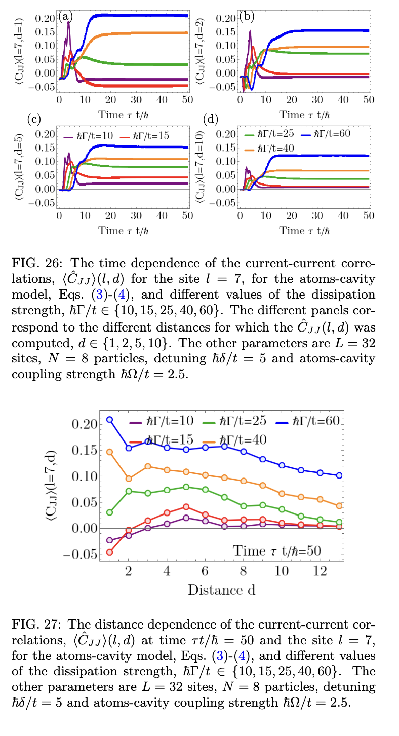 相比之下,在原子-腔模型(公式(3)-(4))中,我们在整个原子链上均获得了有限的电流值,且随着光子损耗增强,电流值进一步增大。在此情形下,稳态中相互抵消的电流贡献要么来自隧穿项,要么来自腔辅助的隧穿过程——原子通过产生或湮灭光子实现运动。当原子与腔耦合时,我们在系统的大范围区域内获得了有限的电流-电流关联,且这些关联仅随距离缓慢衰减。