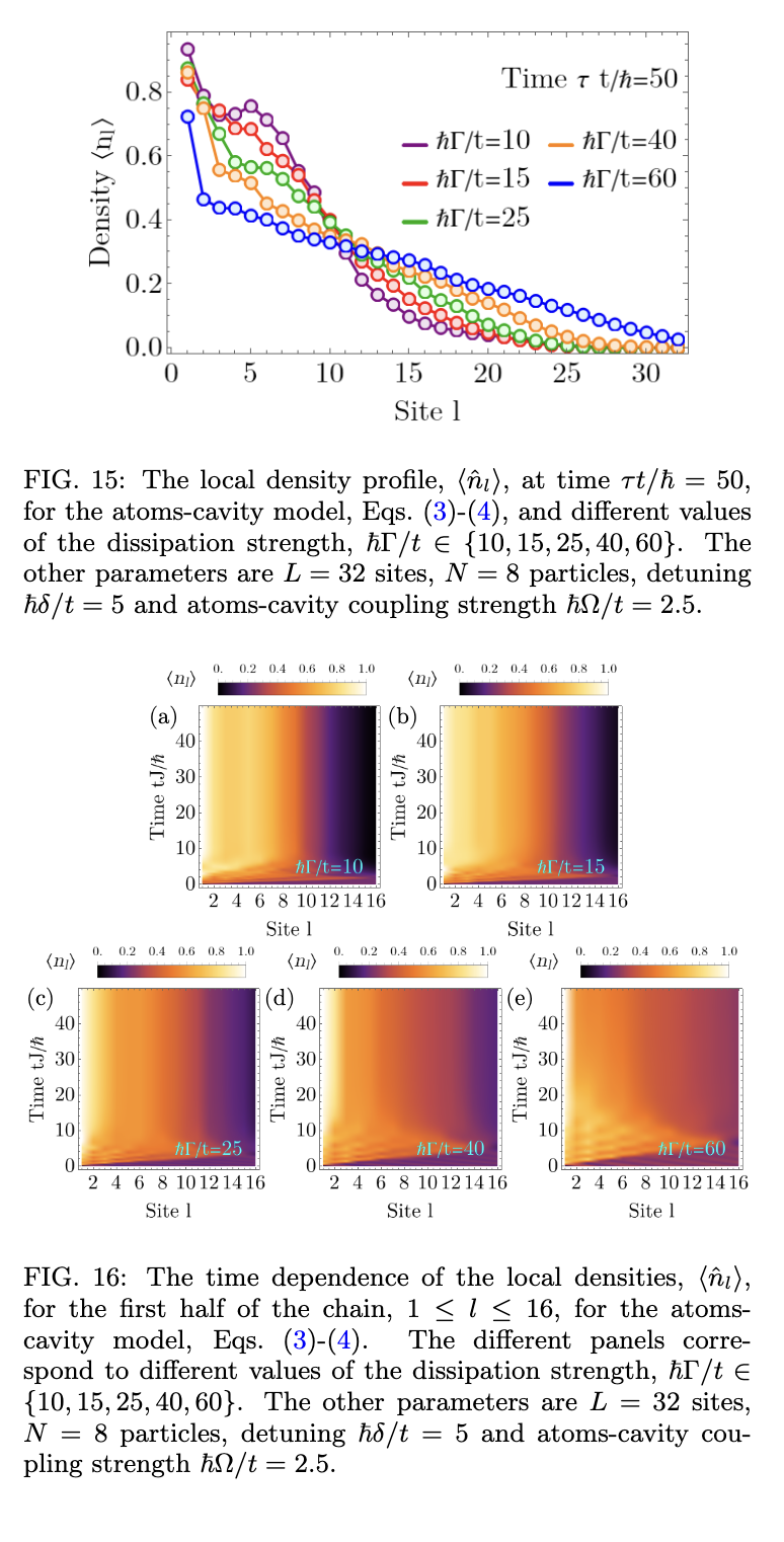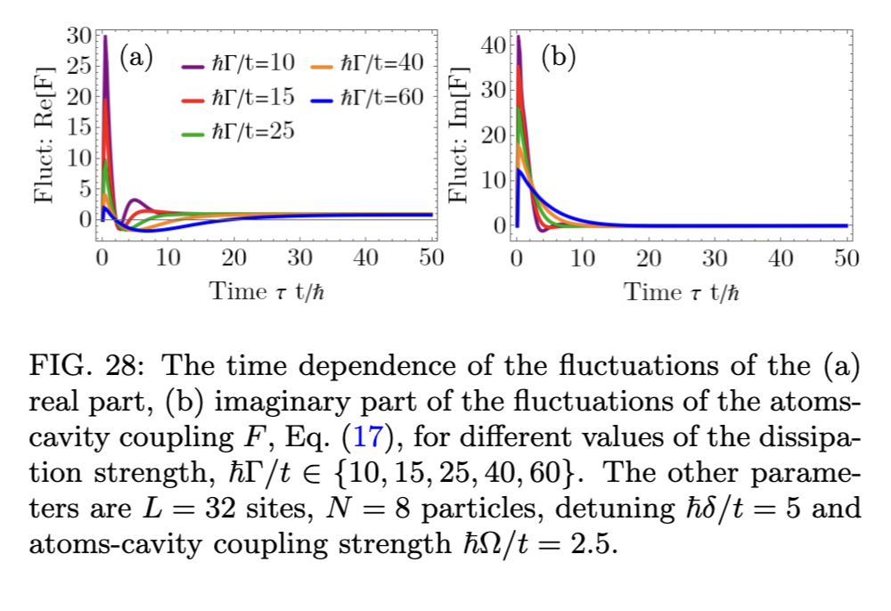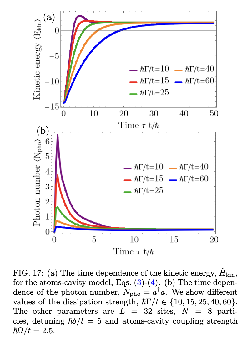 对于两个系统,我们采用相同的协议:初始态为硬核玻色原子的基态;在时间 τ=0时,我们猝灭引入动能耗散或原子与腔的耦合。我们计算系统从猝灭后随时间演化直至接近稳态的行为。