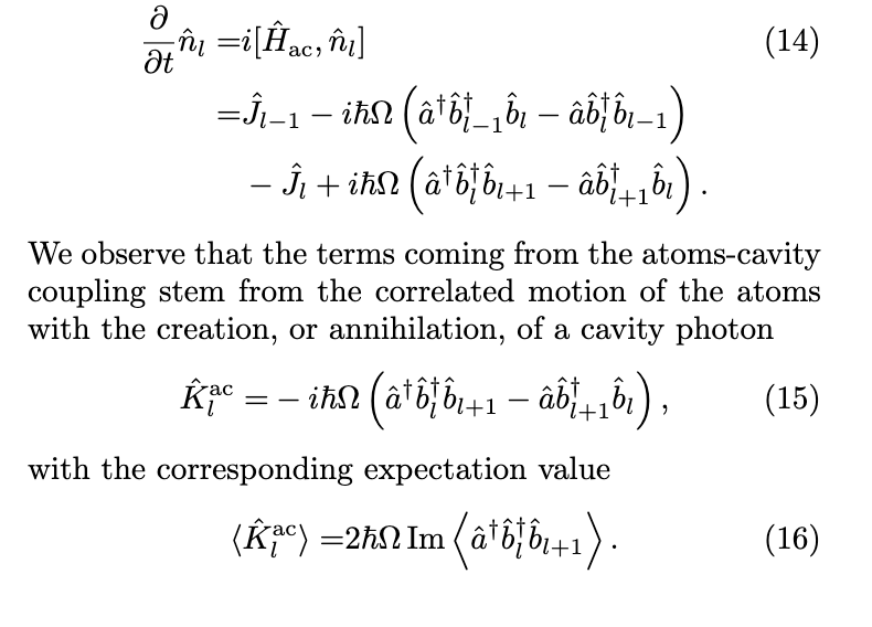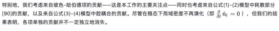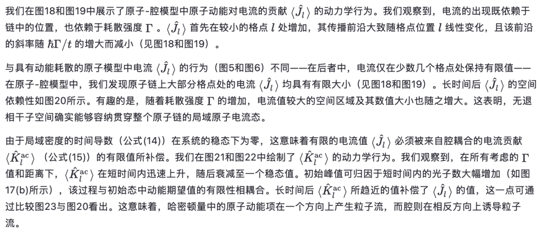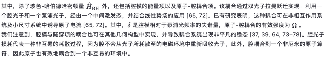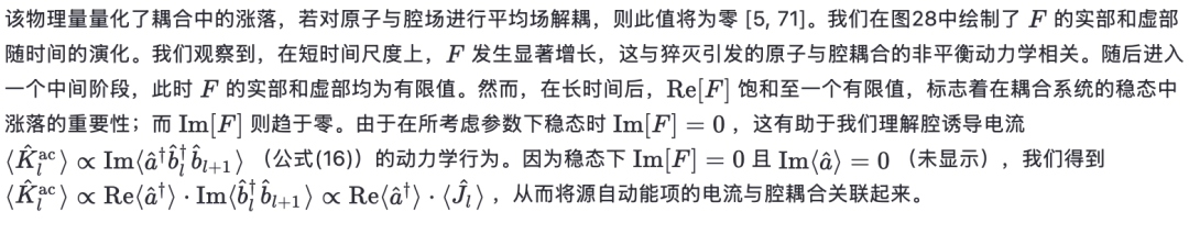 C. 腔对电流的贡献 对于原子-腔模型(公式(3)-(4)),其中腔场与隧穿项耦合,尽管耗散部分不会对电流产生贡献(因为损耗仅作用于腔场),但原子-腔耦合项确实会对电流产生贡献。