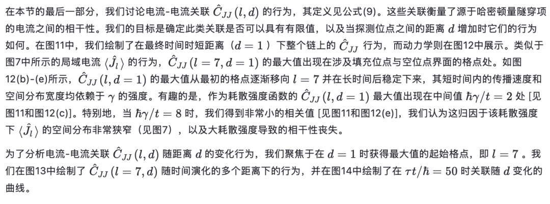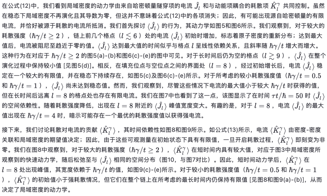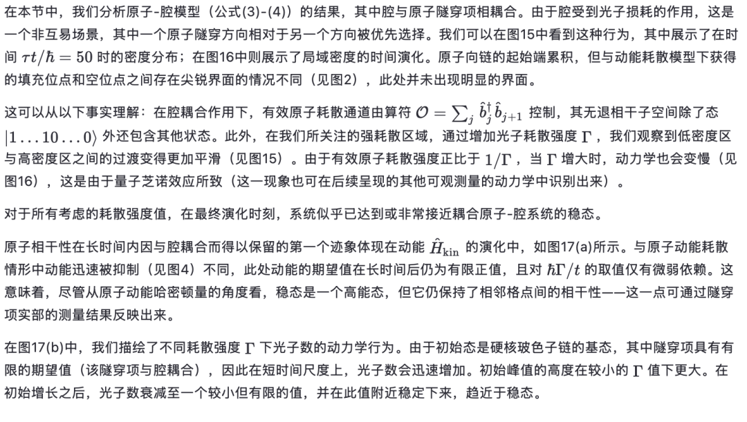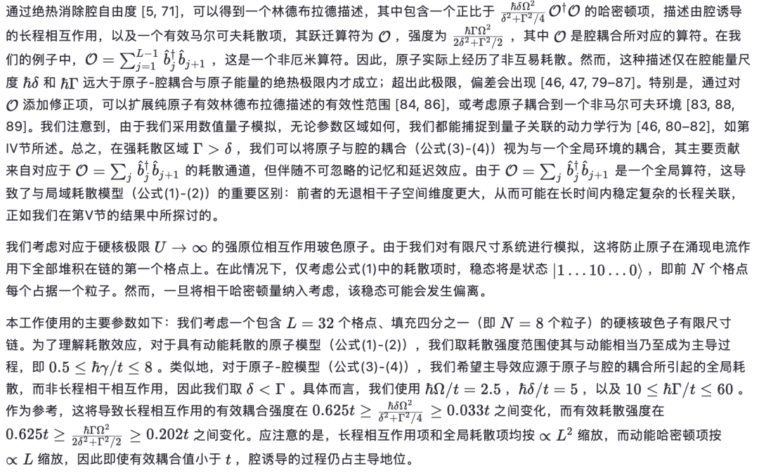 总结本节结果:我们发现,对于通过隧穿项与耗散腔场耦合的一维硬核玻色子链,当腔光子损耗较大时,整个链上可获得强局域电流。此外,原子还表现出仅随距离缓慢衰减的有限电流-电流关联。这表明,从与耗散环境的全局耦合中可以涌现出复杂的相干量子动力学。