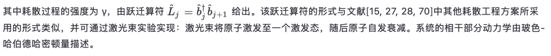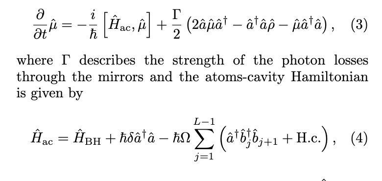 B. 腔介导的耗散 第二种装置是一个混合系统,由置于高精细度光学腔内的一维相互作用玻色子原子晶格构成,系统受到横向驻波激光束泵浦,并通过腔镜发生光子损耗,如图1(b)所示。光学腔中的超冷原子已成为实现耗散耦合和长程相互作用的主要平台之一 [5, 71]。原子与腔场耦合自由度的联合密度矩阵 μ 遵循以下林德布拉德主方程演化 [5, 68, 69, 71]: