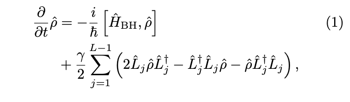 我们研究的第一个装置是一维玻色-哈伯德(Bose-Hubbard)模型,其中包含具有方向性的隧穿耗散过程,如图1(a)所示。我们假设这些耗散过程是马尔可夫型的,因此原子密度矩阵 ρ 的动力学由以下林德布拉德(Lindblad)主方程描述 [68, 69]: