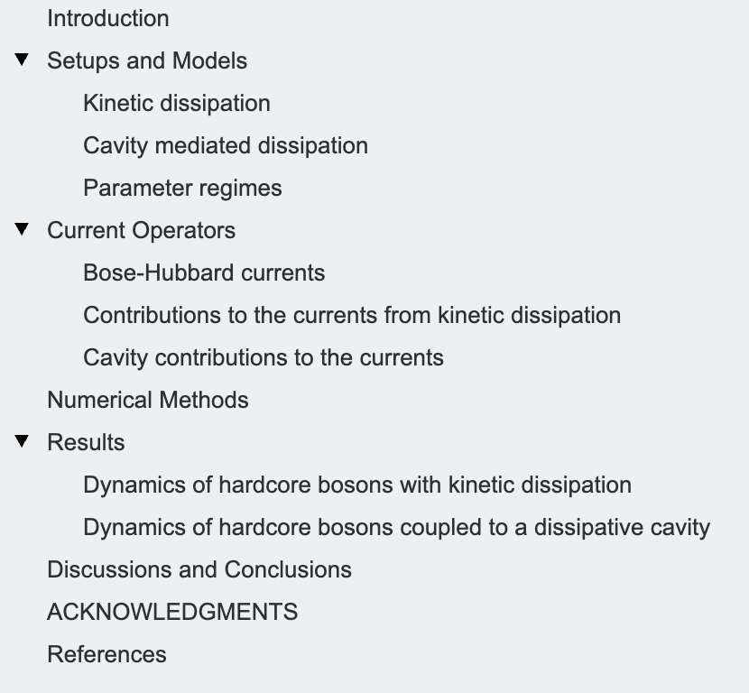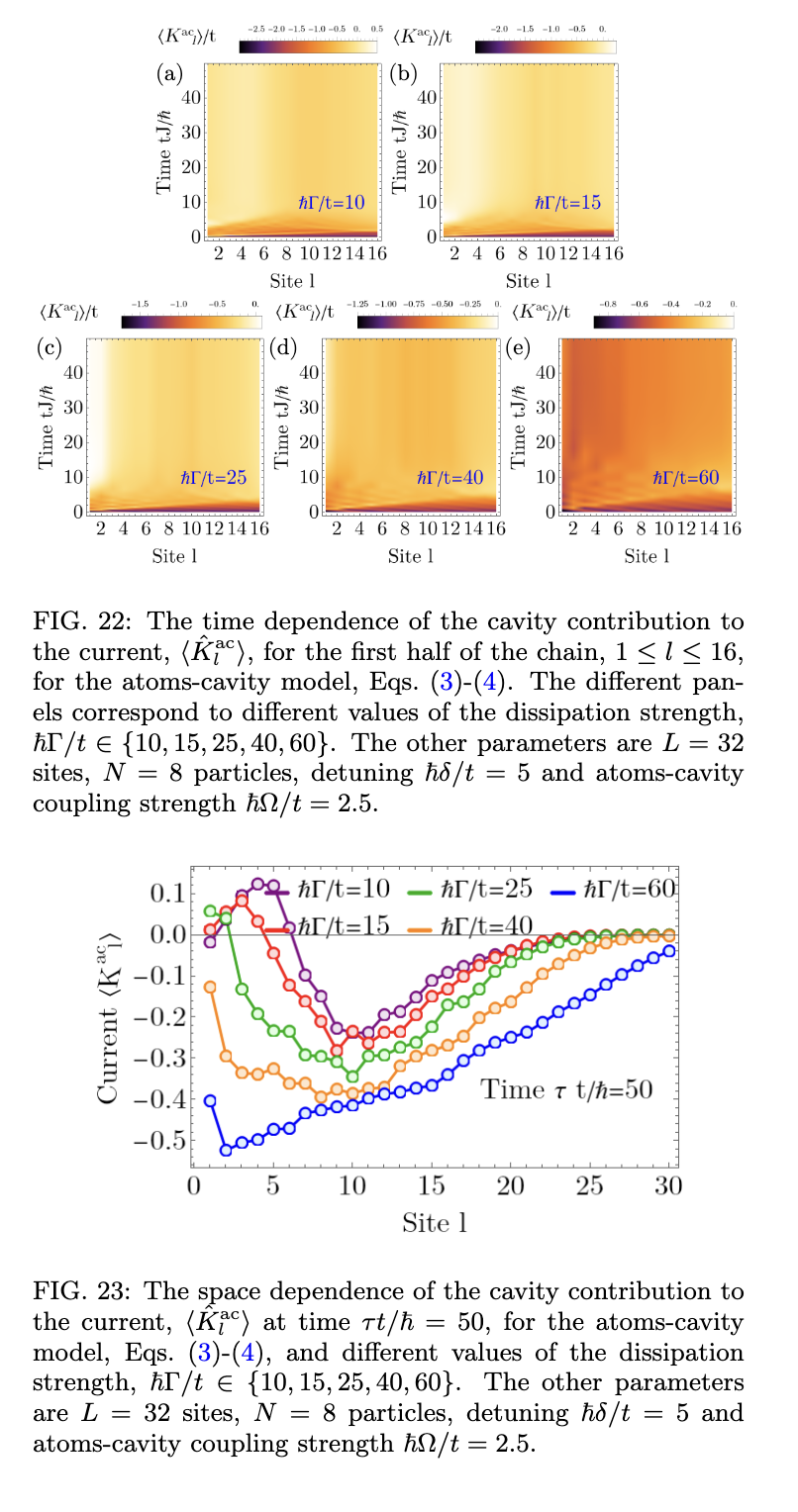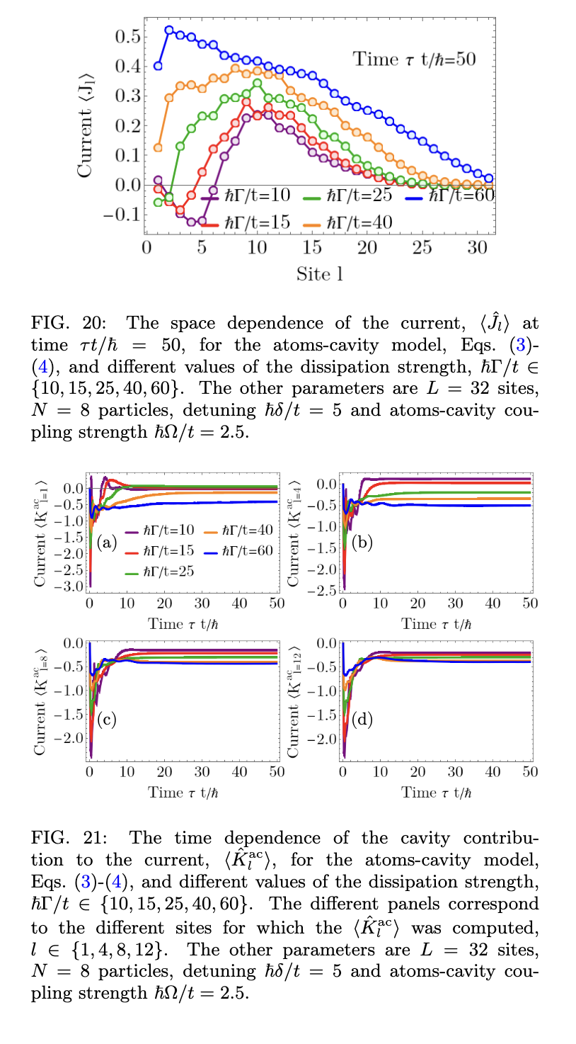 本文所研究的装置与实验直接相关,例如将光晶格中的超冷原子耦合到光学腔场的实验 [107–109]。新一代实验结合了光学腔与显微镜 [110, 111] 或光镊阵列 [112–114],使得探测复杂的长程关联成为可能。电流的动力学已在其他超冷原子实验装置中得到研究,包括储层间的输运测量 [115, 116]、人工磁场背景下的研究 [117] 以及霍尔效应 [57, 58]。近期发展的实验方案甚至能够探测源于隧穿项的局域电流 [118, 119]。此外,尽管本工作聚焦于与光学腔中超冷原子相关的装置,我们预期所得结果对其他混合量子系统也具有更广泛的适用性——例如,离子阱中与声子耦合的离子 [120, 121]、超导电路 [122, 123],或固体腔中的电子系统 [7, 124–126]。