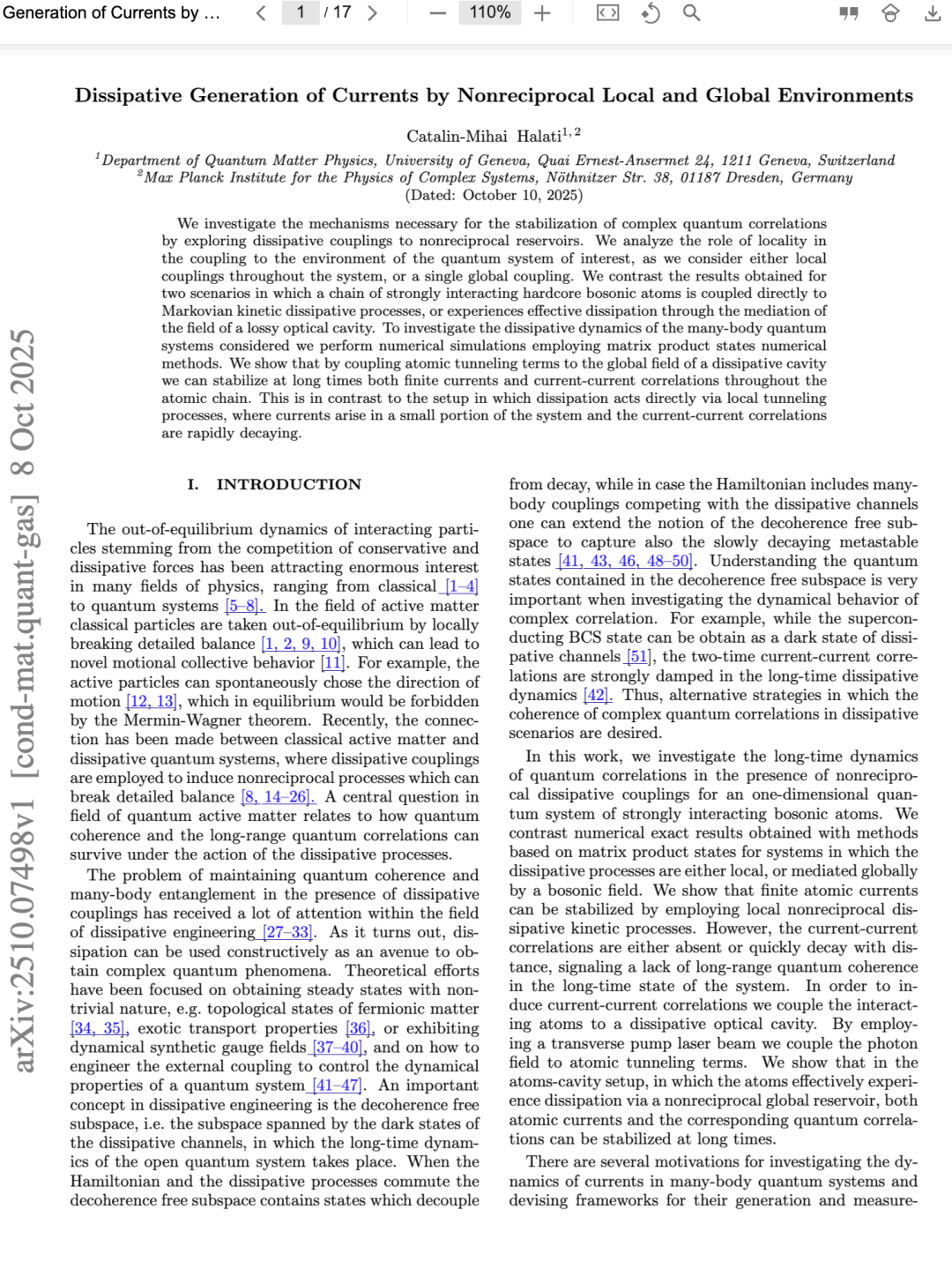 在本工作中,我们研究了一维强相互作用玻色子原子系统在非互易耗散耦合作用下量子关联的长时间动力学。我们对比了基于矩阵乘积态(matrix product states)方法得到的数值精确结果:其中一种情形下耗散过程是局域的,另一种情形下则通过玻色子场进行全局中介。我们表明,通过局域的非互易耗散动能过程可以稳定有限的原子电流。然而,电流-电流关联要么完全缺失,要么随距离迅速衰减,表明系统长时间态中缺乏长程量子相干性。为了诱导电流-电流关联,我们将相互作用原子耦合到一个耗散型光学腔中。通过施加横向泵浦激光束,我们将光子场与原子隧穿项耦合起来。我们证明,在原子-腔系统中——其中原子通过一个非互易的全局库有效经历耗散——原子电流及其相应的量子关联均可在长时间尺度上被稳定下来。