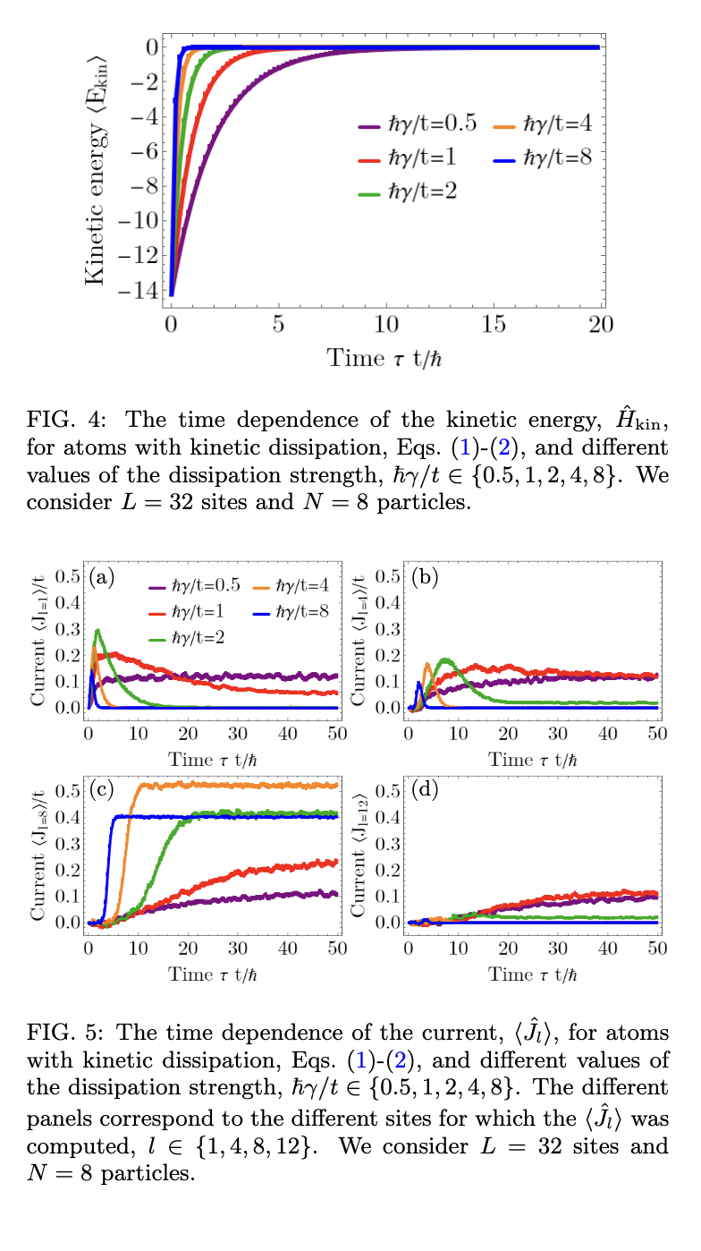 以下,我们将呈现所考虑的两个模型的耗散动力学结果。我们重点关注电流可观测量及其相关的电流-电流关联(参见第III节)的行为;然而,为了更深入地理解最终的动力学行为,我们也展示了其他可观测量的结果。我们首先在第V A节讨论经历动能耗散的硬核玻色原子系统 [如图1(a)所示,公式(1)-(2)] 的结果,并在第V B节中将这些结果与耦合至耗散腔的硬核玻色原子系统 [如图1(b)所示,公式(3)-(4)] 所得结果进行对比。