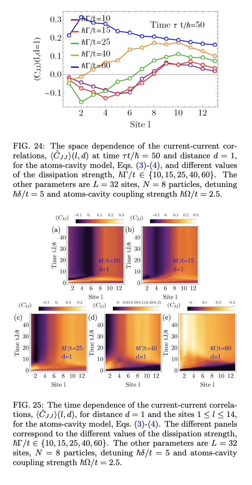 我们将这两种模型截然不同的行为归因于其无退相干子空间(decoherence-free subspace)本质上的差异:前者由大量局域算符张成,而后者则由单一的全局模式所张成。这使得与腔的耦合能够诱导并长期保护电流-电流关联。因此,通过将相互作用原子耦合到光学腔场,我们获得了一个能够展现复杂长程量子关联的平台。人们还可以进一步设想,在此类混合耗散系统中研究多时间关联 [42, 104–106] 的激动人心前景,以探索非局域性与非互易性之间的相互作用。
