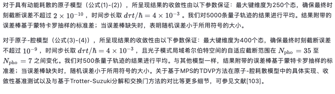 我们在第II节中所呈现模型的数值精确量子动力学结果,基于矩阵乘积态(MPS)技术 [91, 92]。我们通过采用量子轨迹的随机展开方法来处理耗散耦合 [93–95]。在此方法中,我们模拟波函数(即量子轨迹),而非密度矩阵,但需额外进行所有采样轨迹的蒙特卡罗平均。对于具有短程相互作用的原子模型(公式(1)-(2)),我们利用基于Trotter-Suzuki分解的时间演化算符构建的准精确含时变分矩阵乘积态(tMPS)[91, 96, 97] 进行时间演化计算。而对于包含全局长程耦合的原子-腔模型(公式(3)-(4)),其数值结果则通过基于矩阵乘积态的含时变分原理方法(TDVP)的双站点版本实现 [98, 99]。我们的方法借助ITensor库实现 [100]。