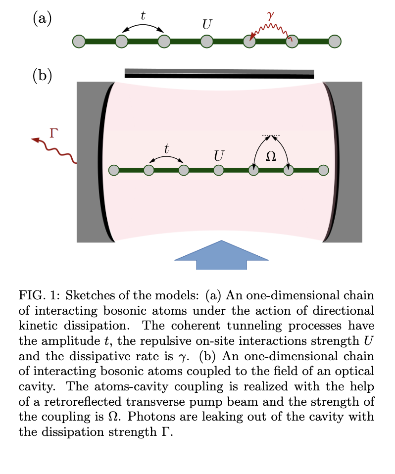 我们考虑被限制在一维光晶格中的相互作用玻色子原子,其受到非互易耗散耦合的作用,旨在诱导原子电流。在第一个模型(见第II A节)中,耗散以局域隧穿过程的形式直接作用于原子。在第二个模型(见第II B节)中,光学腔的场与原子隧穿项耦合,光子通过腔镜发生损耗;在此情形下,原子经历一种有效的全局耗散。