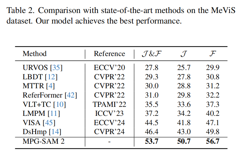 MeViS 数据集。 我们还在 MeVis [11] 数据集上对 MPG-SAM 2 与现有方法(包括 URVOS [35]、LBDT [12]、MTTR [4]、ReferFormer [42]、VLT+TC [10]、LMPM [11]、VISA [45] 和 DsHmp [14])进行了对比实验,结果记录在表2中。在该数据集上,我们的方法获得了 53.7% 的 J &F 分数,超过了当前最先进的方法 DsHmp 7.3% J &F,证明了我们在利用时间信息方面的有效性。