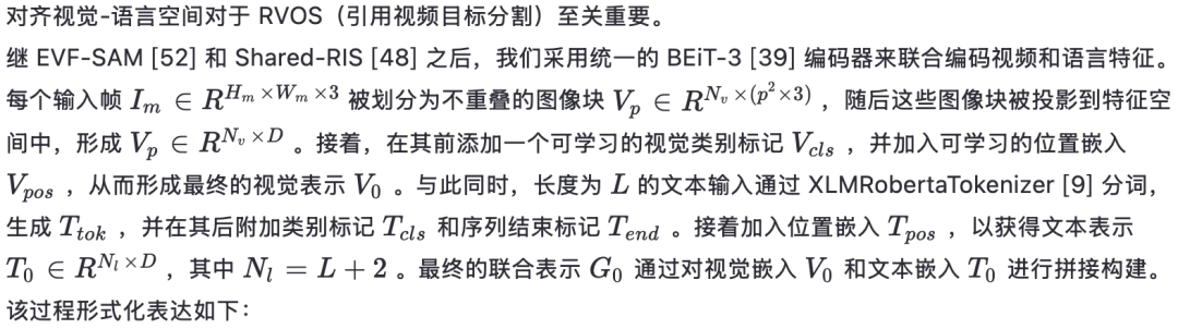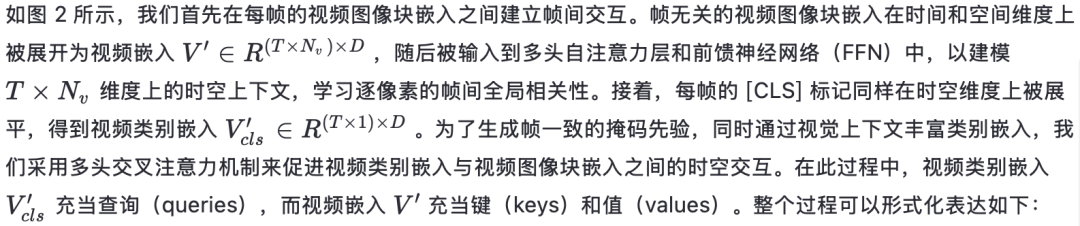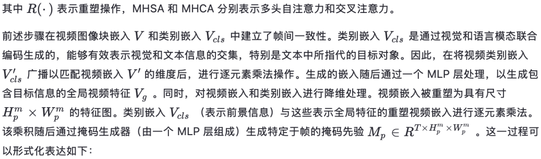 3.3. 掩码先验生成器 尽管在视频图像块嵌入 V和文本嵌入 T之间的语义对齐已被证明具有显著效果,我们发现当前框架中存在两个关键限制:(1) SAM 2 的视频特征 F固有地缺乏语言上下文,导致其与文本表示之间存在语义差距;(2) [CLS] 标记的帧无关特性限制了其建模视频序列中时间依赖性的能力,往往会导致分割伪影,包括目标错位和时间不一致性。为缓解这些限制,我们提出了一种新颖的方法,通过将 [CLS] 标记与语言增强的视频图像块嵌入融合,生成特定于帧的伪掩码先验。这些动态生成的先验提供了精确的像素级指导,显著增强了 SAM 2 的解码过程。