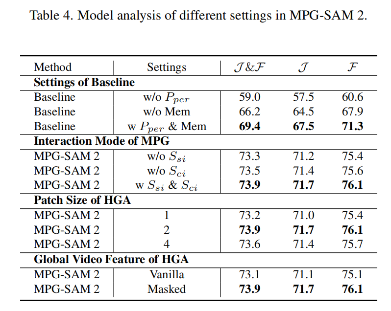 4.4. 模型分析 在本节中,我们进行了全面的消融实验,以考察我们 MPG-SAM 2 中关键组件的效果以及不同模型配置的影响。所有实验均使用 Ref-Youtube-VOS 数据集进行。