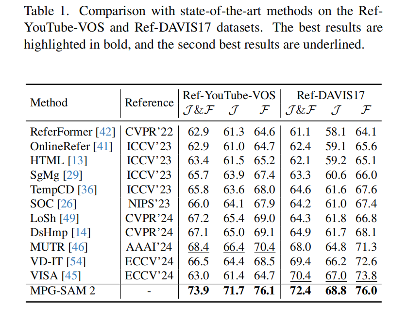 4.3. 与现有最先进方法的比较 Ref-YouTube-VOS 和 Ref-DAVIS17 数据集。 我们将所提出的 MPG-SAM 2 方法与几种最先进的方法进行了比较,结果如表1所示。我们的方法在两个数据集上均优于所有现有方法。在 Ref-YouTube-VOS [35] 数据集上,我们取得了 73.9% 的 J &F 分数,超过了最佳方法 DsHmp [14] 达 6.8% J &F,超过了 LoSh [49] 达 6.7% J &F。即使与使用额外训练数据的方法相比,我们的模型也表现出竞争力,超过 MUTR [46] 5.5% J &F。在 Ref-DAVIS [17] 数据集上,我们的方法达到了 72.4% 的 J &F 分数,比 VD-IT [54] 高出 3.0% J &F,并且超过了在额外数据集上训练的 VISA [45] 2.0% J &F。所有对比方法都采用了最优配置以突出模型性能。