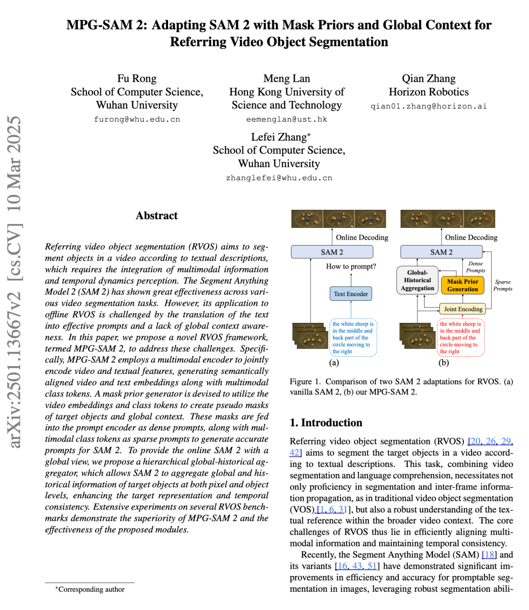 摘要 参考视频对象分割(Referring Video Object Segmentation, RVOS)旨在根据文本描述对视频中的对象进行分割,这需要整合多模态信息和时间动态感知能力。Segment Anything Model 2(SAM 2)在各种视频分割任务中展现了卓越的效果。然而,其在离线RVOS中的应用面临两个主要挑战:将文本转化为有效的提示以及缺乏全局上下文感知。本文提出了一种新颖的RVOS框架,称为MPG-SAM 2,以应对这些挑战。具体而言,MPG-SAM 2采用多模态编码器联合编码视频和文本特征,生成语义对齐的视频和文本嵌入,以及多模态类别标记。设计了一个掩码先验生成器,利用视频嵌入和类别标记为目标对象及全局上下文生成伪掩码。这些掩码作为密集提示输入到提示编码器中,同时多模态类别标记作为稀疏提示,以生成适用于SAM 2的精确提示。为了为在线SAM 2提供全局视角,我们提出了一种分层的全局-历史聚合器,使SAM 2能够在像素级和对象级聚合目标对象的全局和历史信息,从而增强目标表示和时间一致性。在多个RVOS基准上的广泛实验表明了MPG-SAM 2的优越性以及所提模块的有效性。