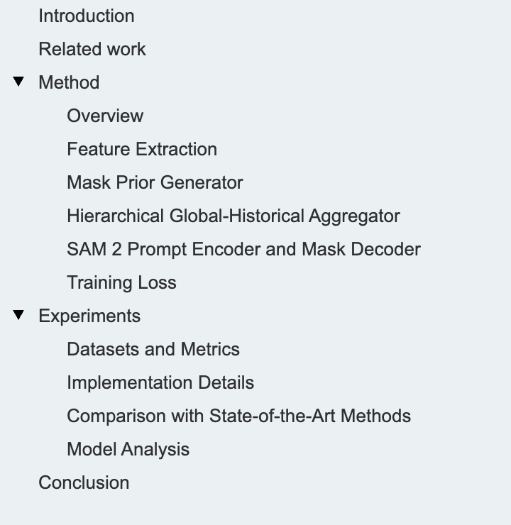 • 我们提出了一种新颖的RVOS框架MPG-SAM 2,基于SAM 2引入了基于掩码先验的密集提示和多层次全局上下文融合,实现了在多个RVOS基准上的前沿性能。 • 我们设计了一种掩码先验生成器,利用全局视频特征和多模态类别标记为目标对象生成伪掩码,提供先前的位置线索作为密集提示,从而增强SAM 2的掩码解码能力。 • 我们开发了一种分层的全局-历史聚合器,将目标对象的全局上下文和历史记忆信息在像素级和对象级整合到SAM 2中。该模块使在线模式的SAM 2能够具备全局视角,增强了目标表示和时间一致性。
