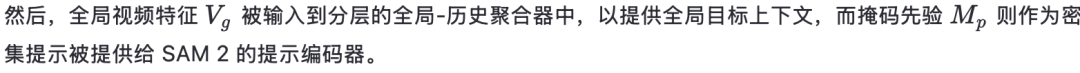 视频嵌入和类别令牌被用于掩码先验生成器,以生成目标对象的伪掩码,作为密集提示为 SAM 2 的掩码解码器提供强有力的定位线索。为了弥补 SAM 2 在离线 RVOS 中缺乏全局上下文感知能力的问题,我们引入了一个分层的全局-历史聚合器。该模块使得 SAM 2 能够在像素级和物体级上整合目标对象的全局上下文和历史信息,从而增强目标表示和时间一致性。