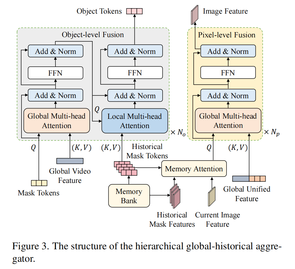 为了将目标对象的全局上下文信息引入SAM 2,我们设计了一种分层的全局-历史聚合器,使SAM 2能够在掩码解码器之前从多个层次聚合目标对象的全局上下文和历史信息。这里的全局上下文主要来源于掩码先验生成器生成的全局视频特征。该聚合器由像素级和对象级融合模块组成。在像素级模块中,当前图像特征依次与SAM 2记忆中的历史特征和全局上下文交互,从而从多个角度增强像素级目标表示。类似地,在对象级模块中,掩码标记从全局视频特征和记忆中的历史掩码标记中聚合目标表示信息,生成用于掩码解码器的对象标记。