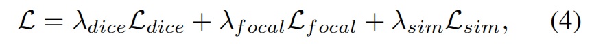 这里,Ldice 是 DICE 损失 [30],Lfocal 表示二值掩码的焦点损失(focal loss),而 Lsim 表示掩码-文本相似性损失,具体如下所述。